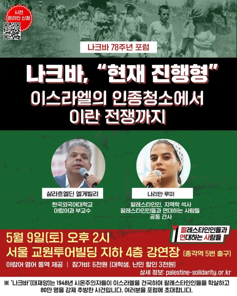‘팔레스타인인들과 연대하는 사람들’은 재한 팔레스타인인, 중동․북아프리카인 등 다양한 이주 배경의 활동가들과 국내 시민사회단체 45곳이 함께합니다. ▶ 소개 | 후원