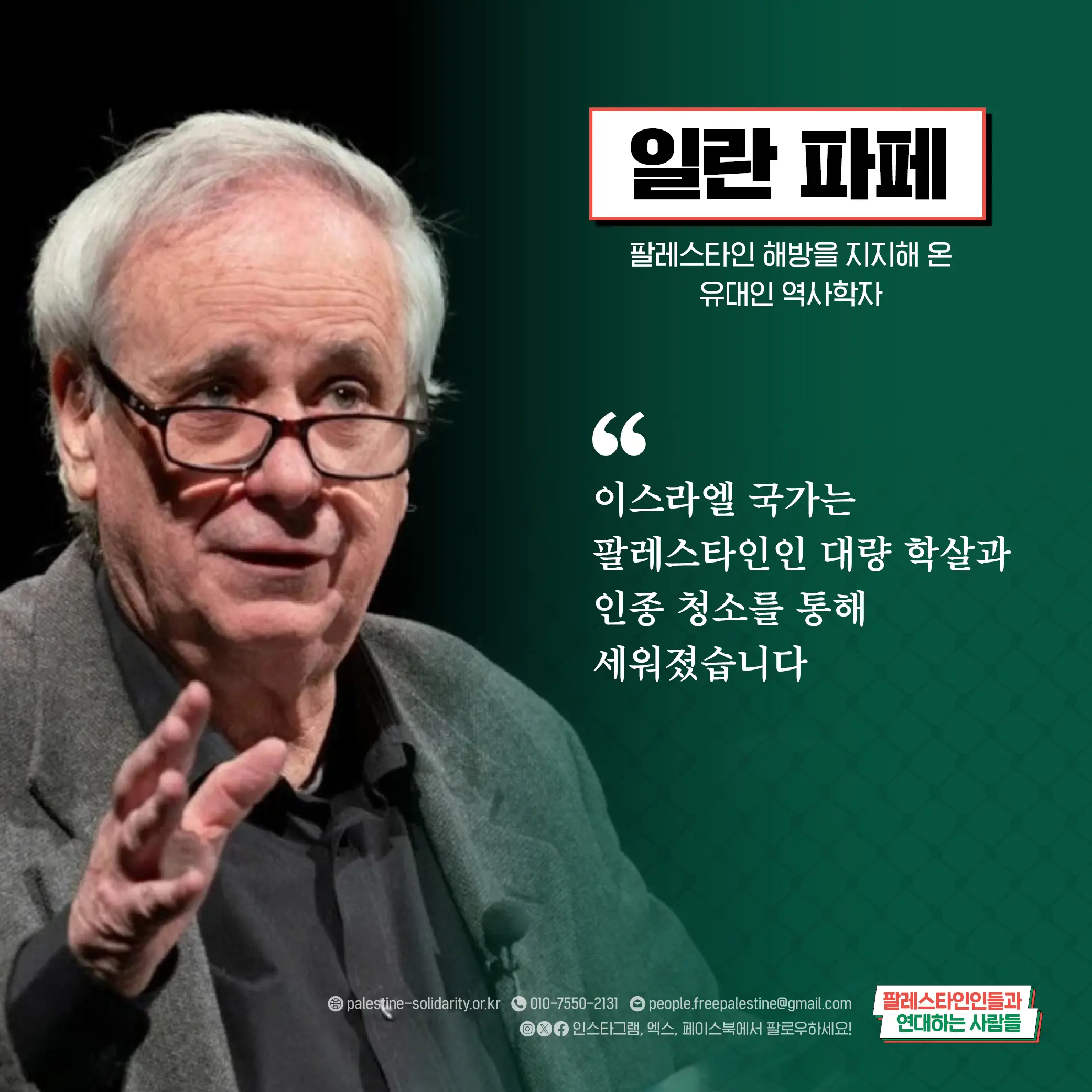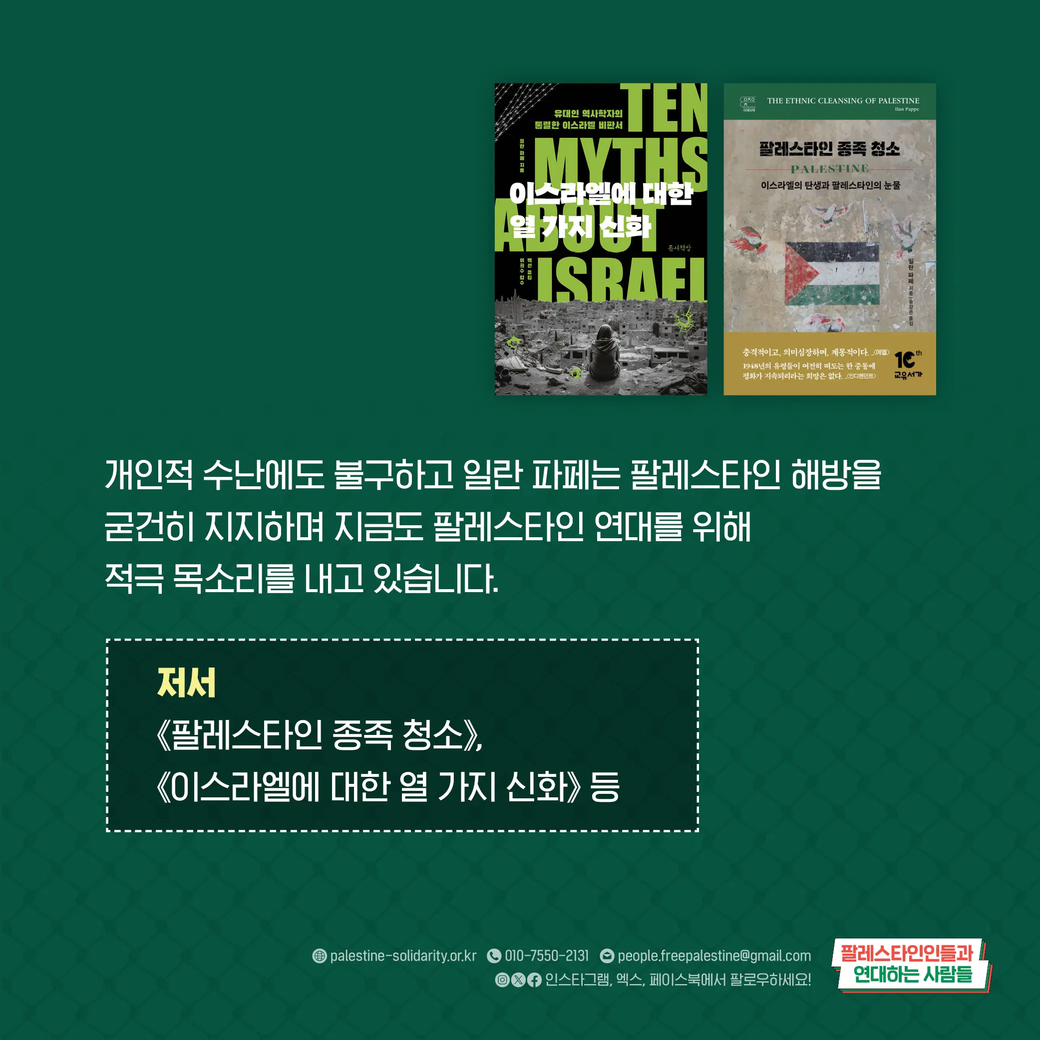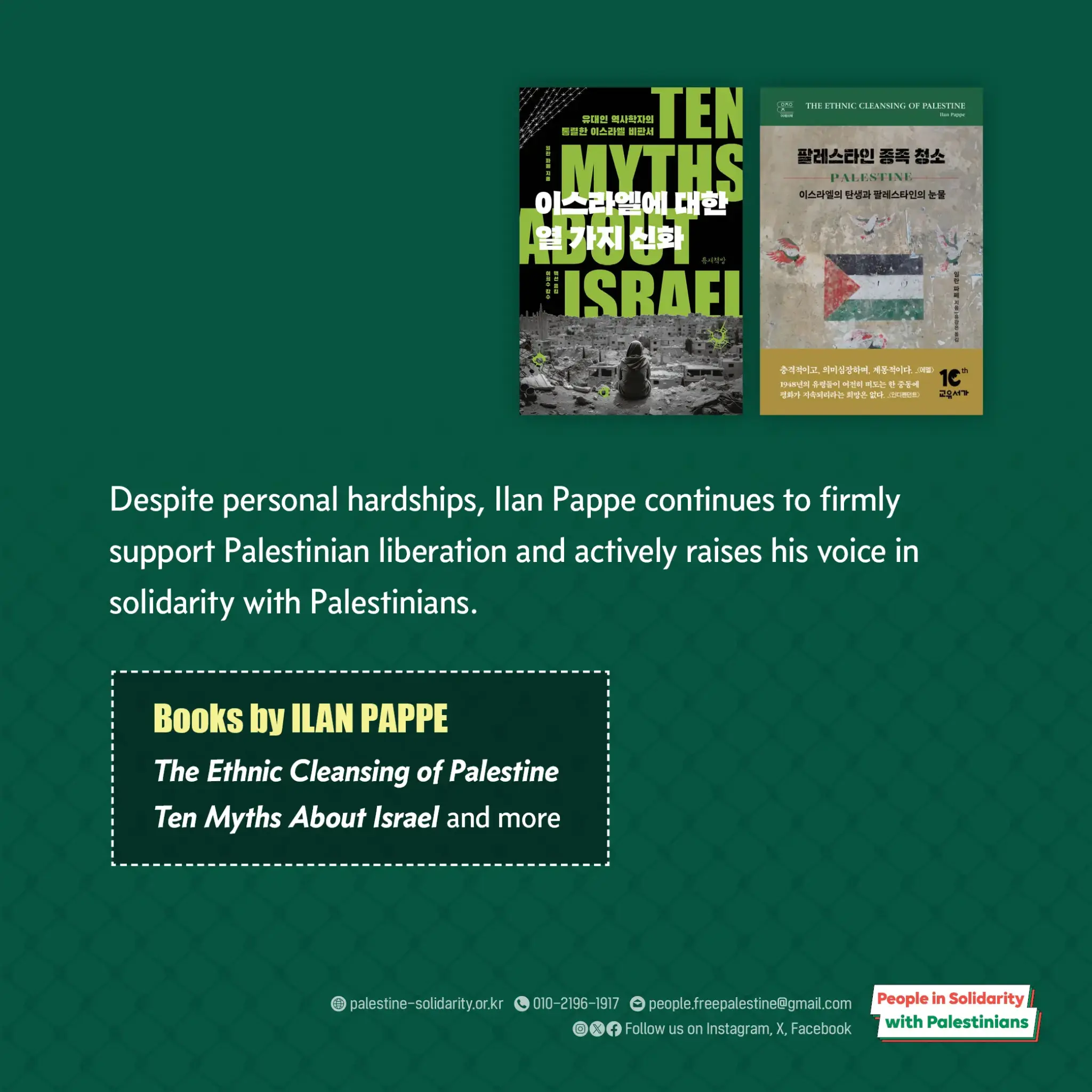 개인적 수난에도 불구하고 일란 파페는 팔레스타인 해방을 굳건히 지지하며 지금도 팔레스타인 연대를 위해 적극 목소리를 내고 있습니다.