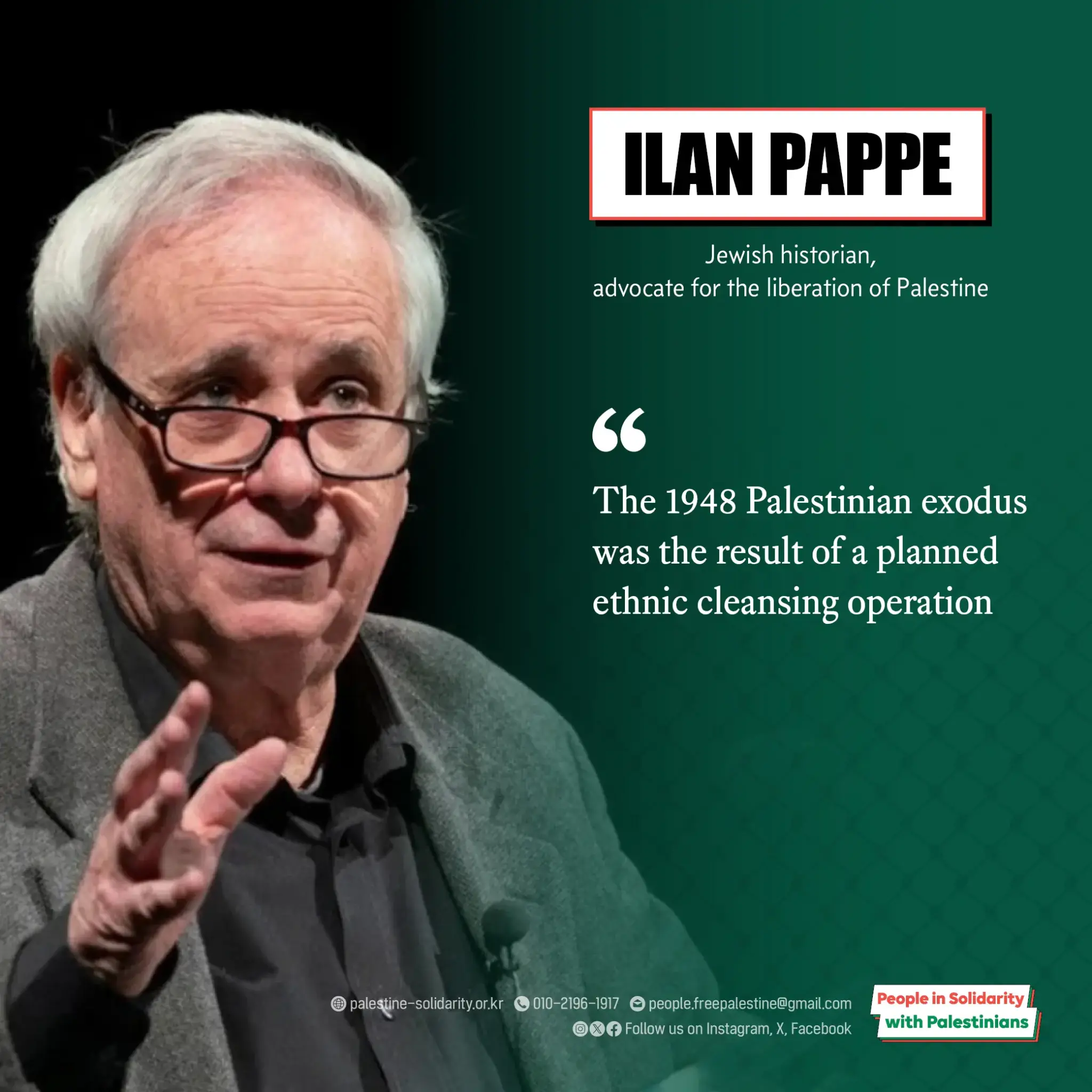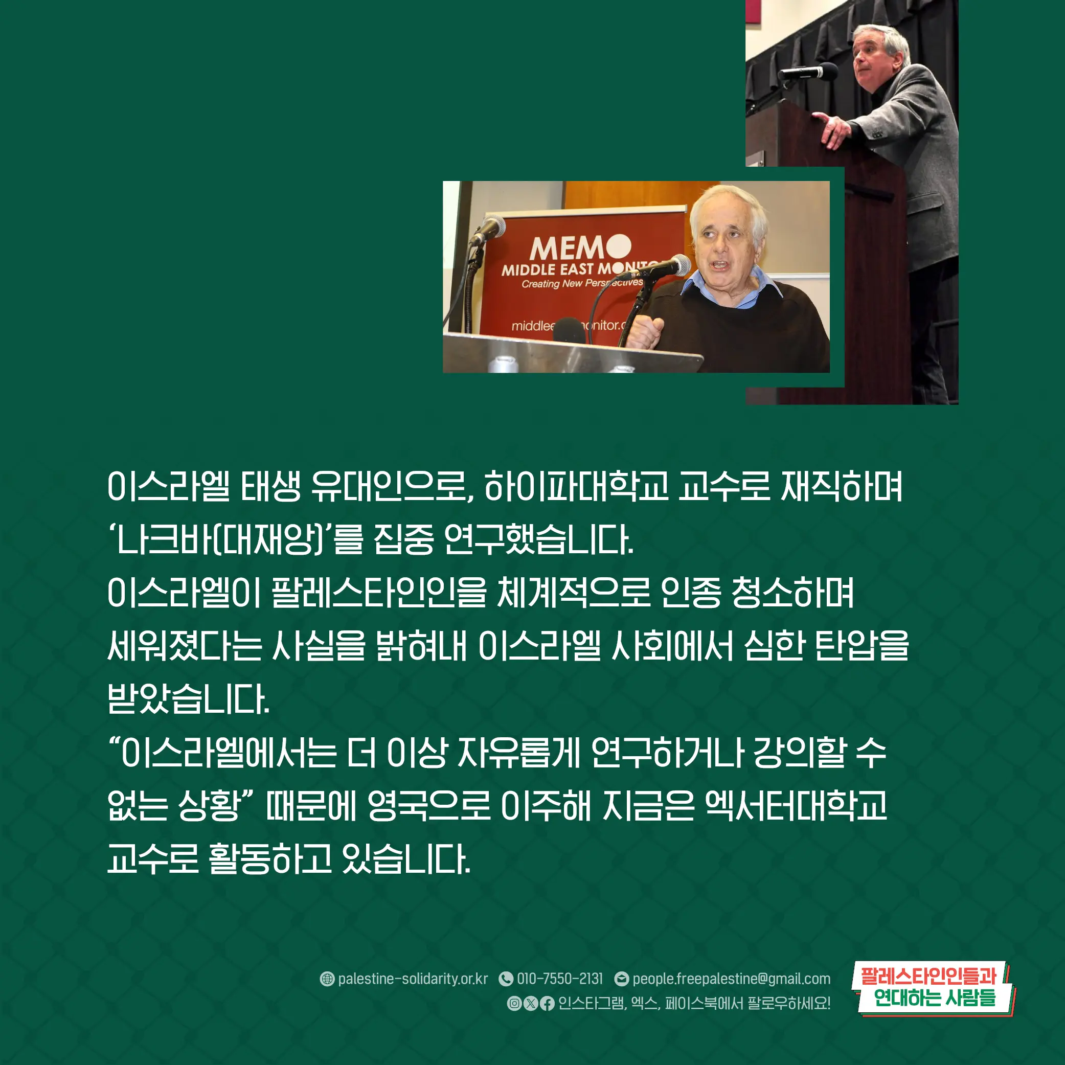 이스라엘 태생 유대인으로, 하이파대학교 교수로 재직하며 ‘나크바(대재앙)’를 집중 연구했습니다. 이스라엘이 팔레스타인인을 체계적으로 인종 청소하며 세워졌다는 사실을 밝혀내 이스라엘 사회에서 심한 탄압을 받았습니다.