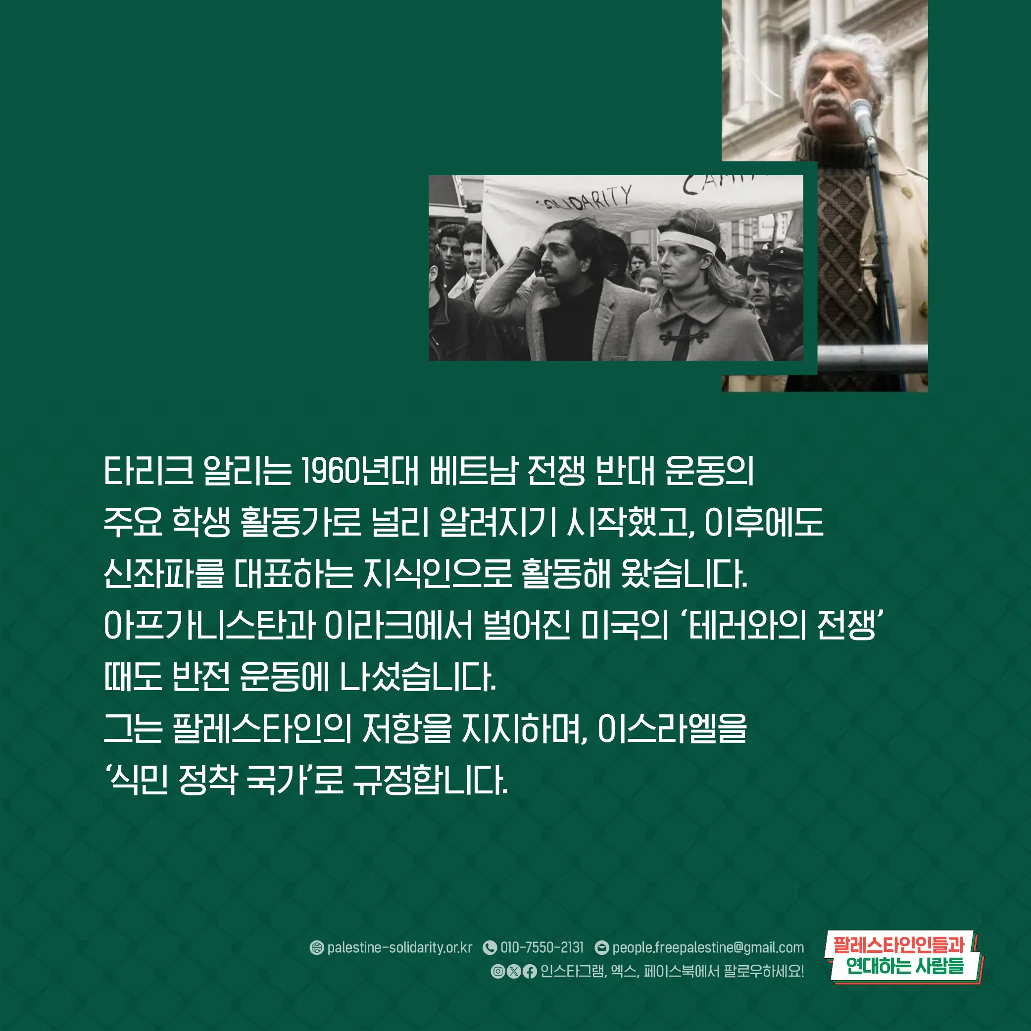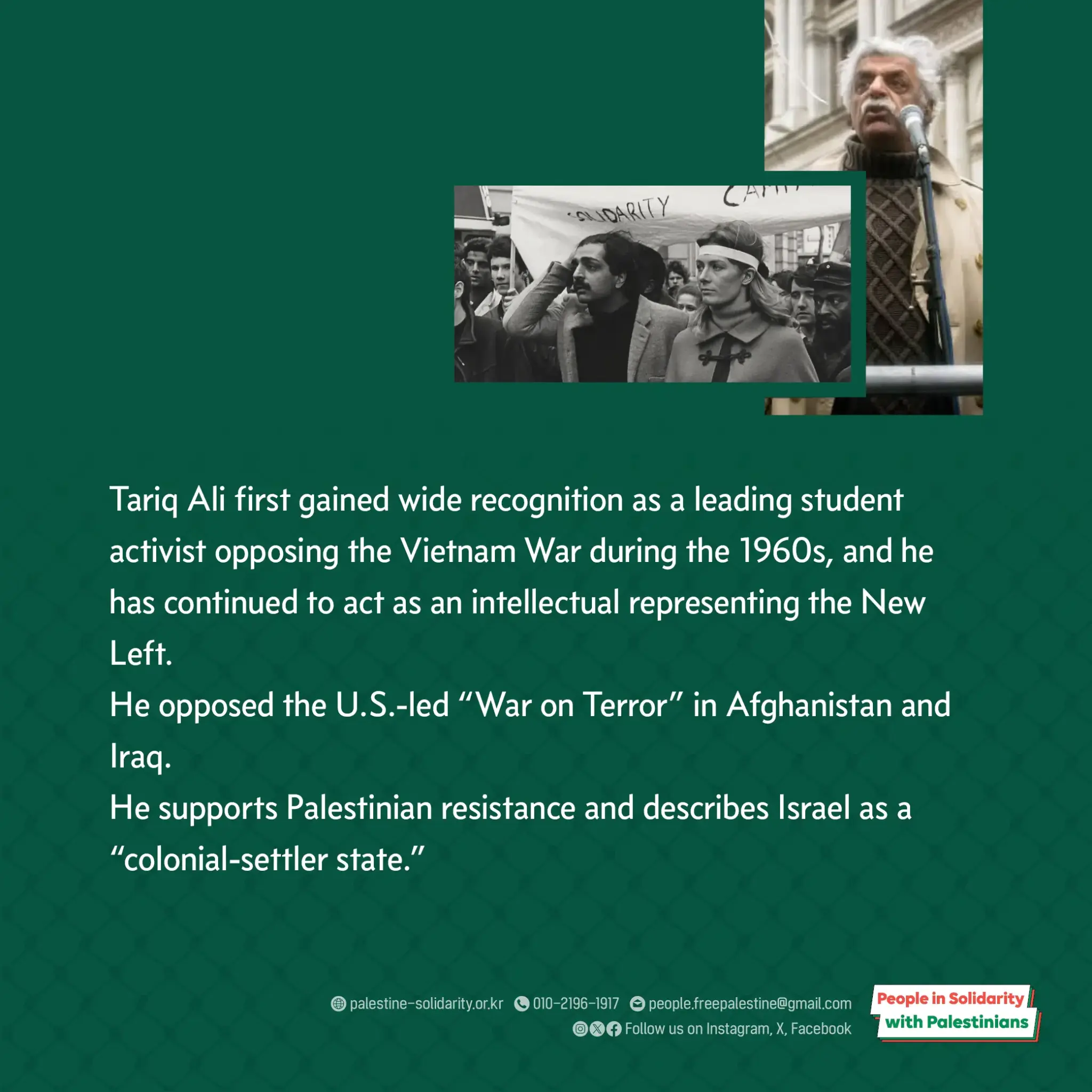 타리크 알리는 1960년대 베트남 전쟁 반대 운동의 주요 학생 활동가로 널리 알려지기 시작했고, 이후에도 신좌파를 대표하는 지식인으로 활동해 왔습니다. 아프가니스탄과 이라크에서 벌어진 미국의 ‘테러와의 전쟁’ 때도 반전 운동에 나섰습니다.
