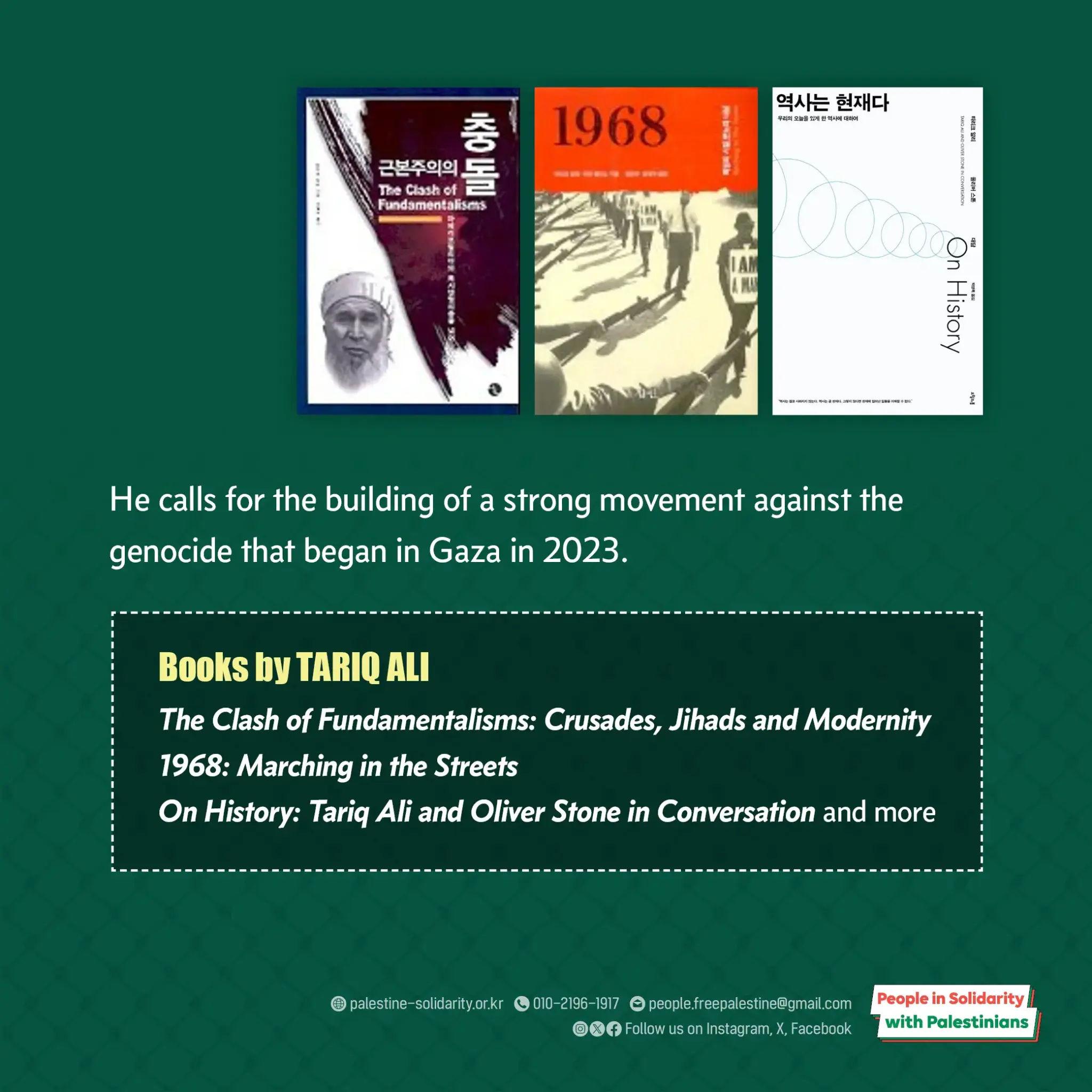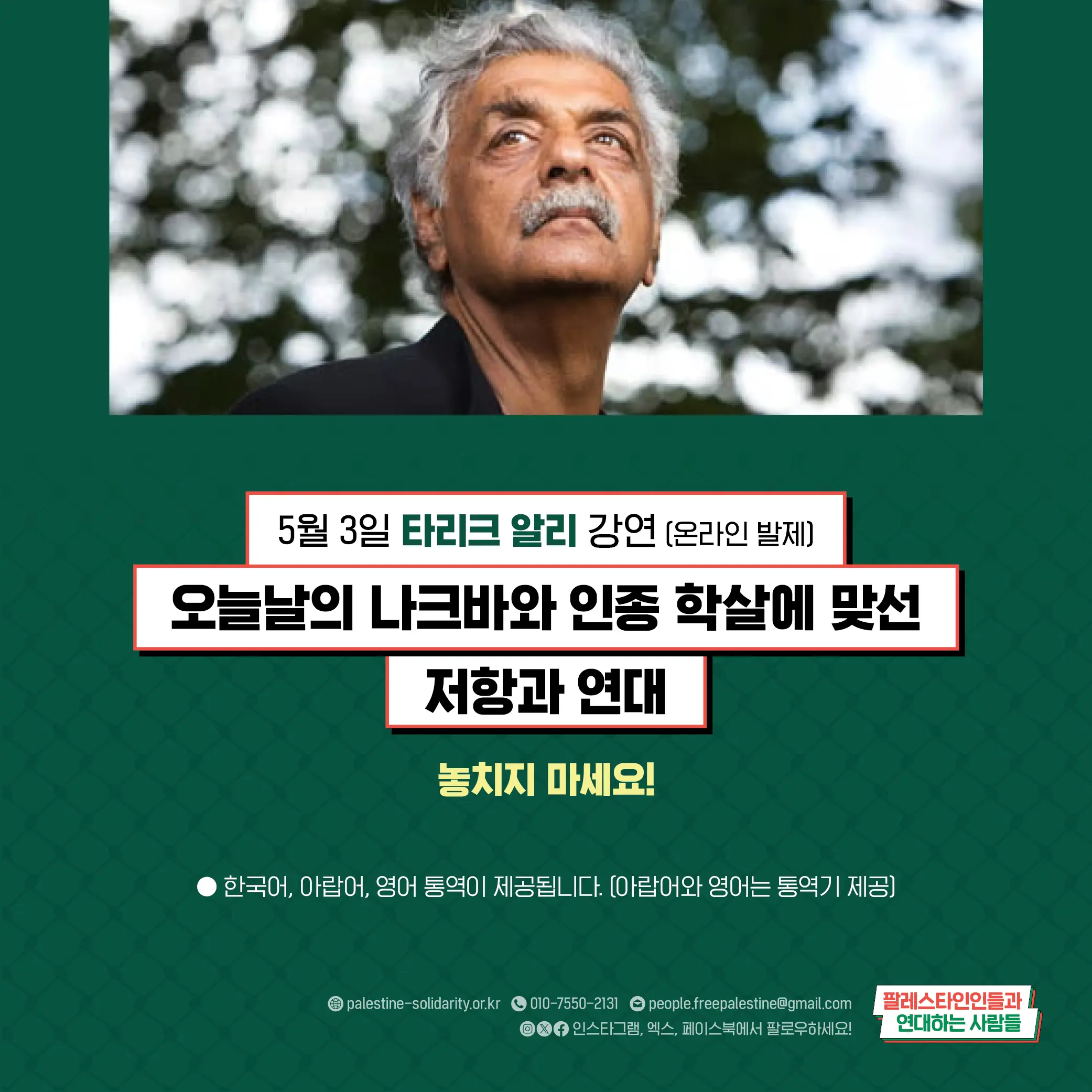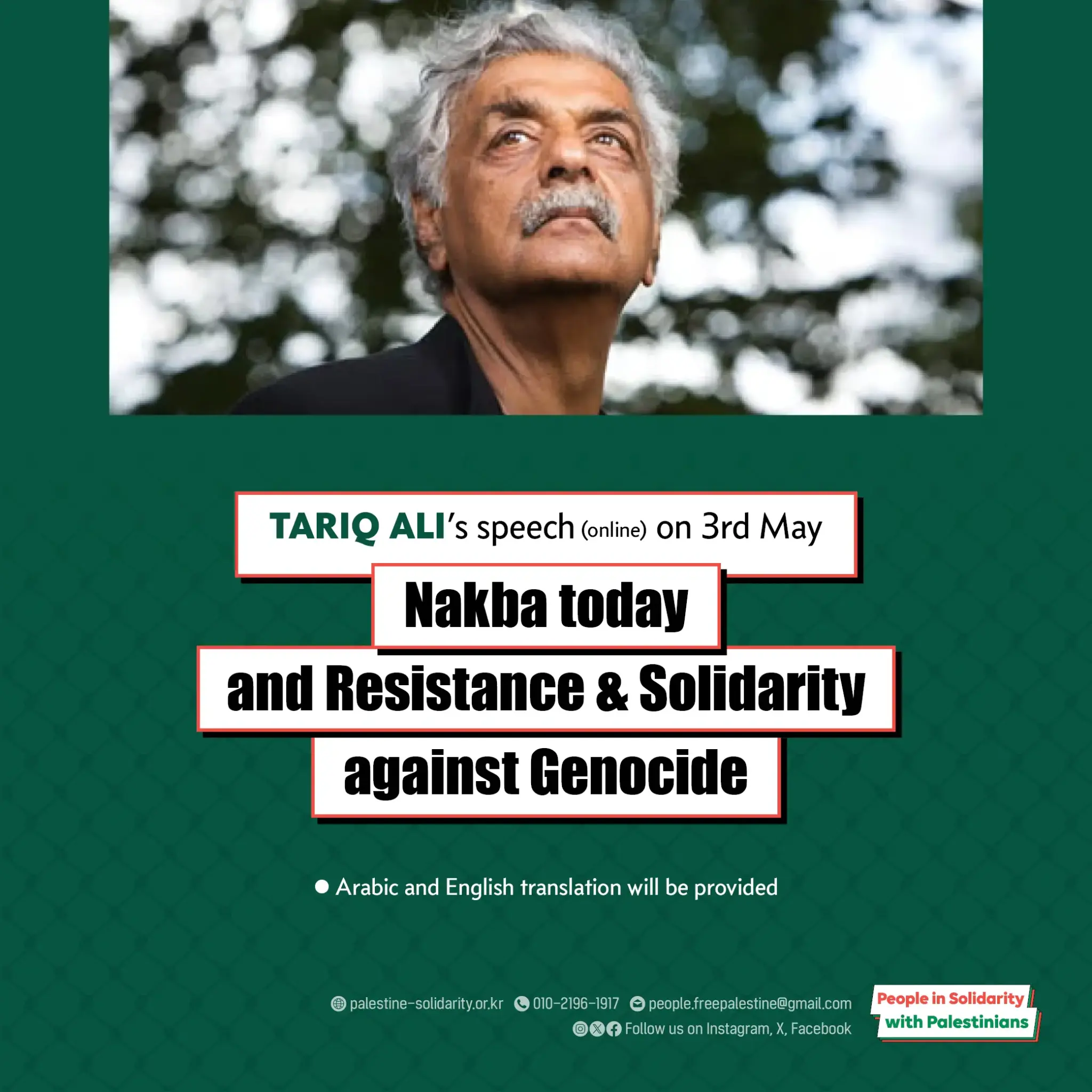 5월 3일, 타리크 알리 강연 “오늘날의 나크바와 인종 학살에 맞선 저항과 연대”를 놓치지 마세요!