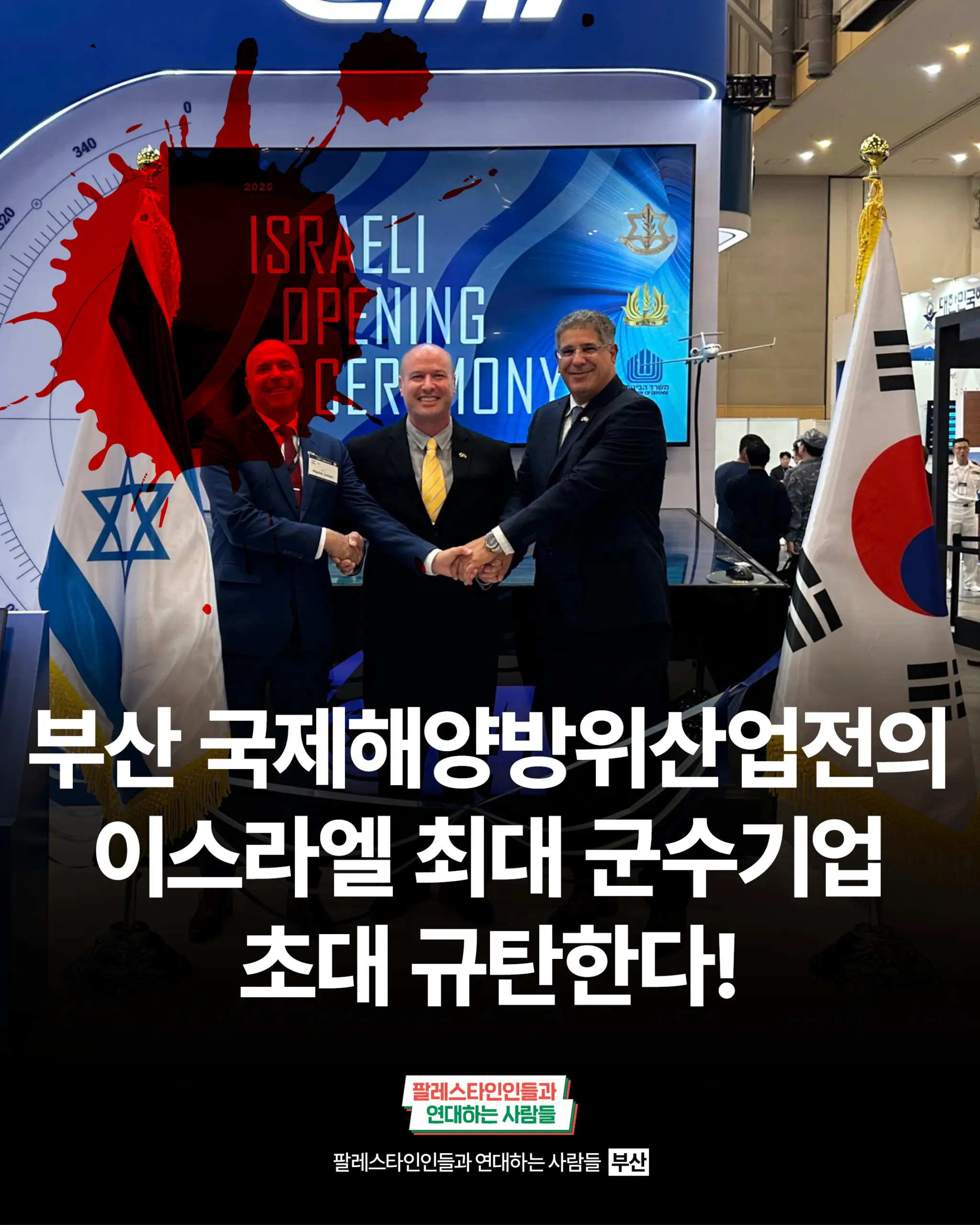 부산 벡스코 전시장에서 국제해양방위산업전이 열리고 있다. 해군과 한국무역협회 등이 주최하는 무기 홍보 행사다. 전쟁으로 큰돈을 버는 기업들이 여럿 참가하는, 안 그래도 역겨운 그 행사에 이스라엘 최대 군수기업 이스라엘항공우주산업(IAI)이 참가하고 있다.