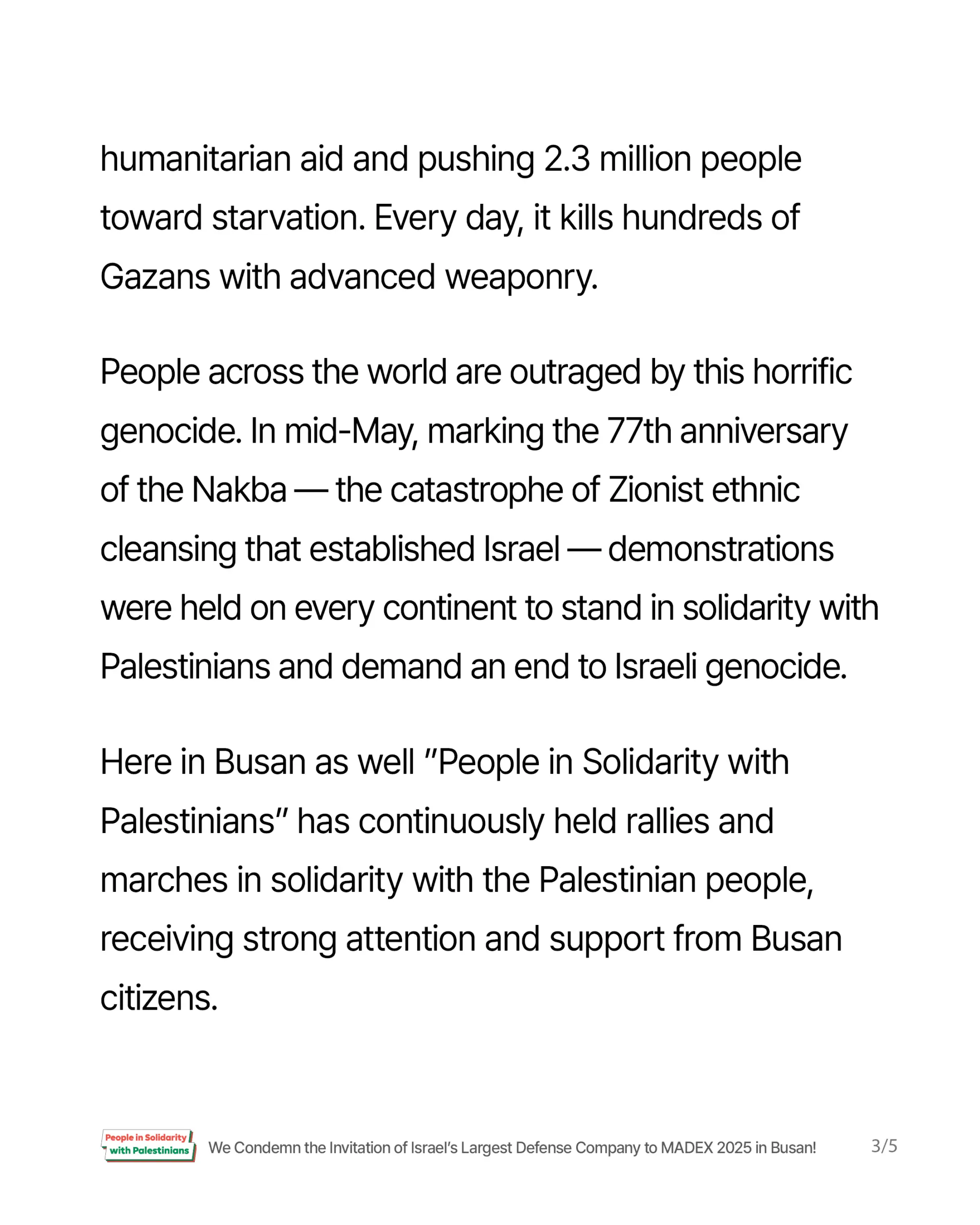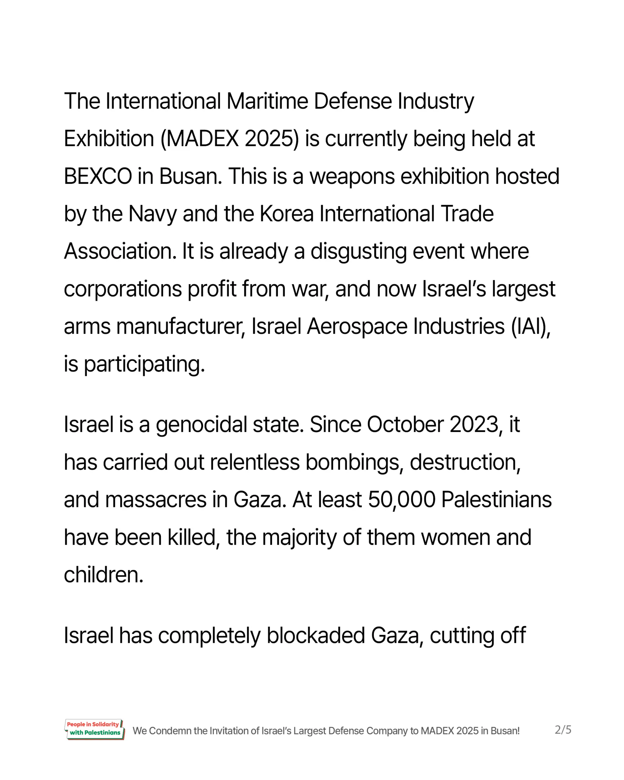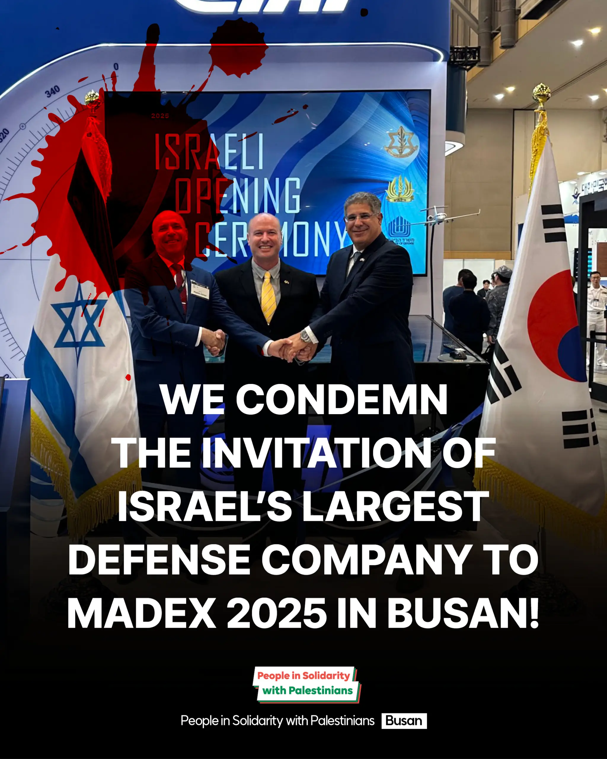 The International Maritime Defense Industry Exhibition(MADEX 2025) is currently being held at BEXCO in Busan. This is a weapons exhibition hosted by the Navy and the Korea International Trade Association. It is already a disgusting event where corporations profit from war, and now Israel’s largest arms manufacturer, Israel Aerospace Industries (IAI), is participating.