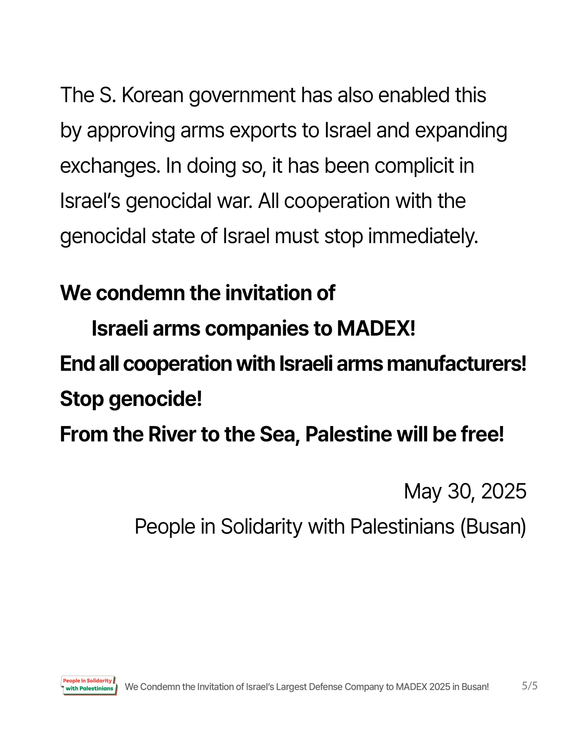 한국 정부 또한 대(對)이스라엘 무기 수출을 허가하고 각종 교류를 늘리며 이스라엘의 인종 학살 전쟁에 공모해 왔다. 인종 학살 국가 이스라엘과의 교류는 즉각 중단돼야 한다.