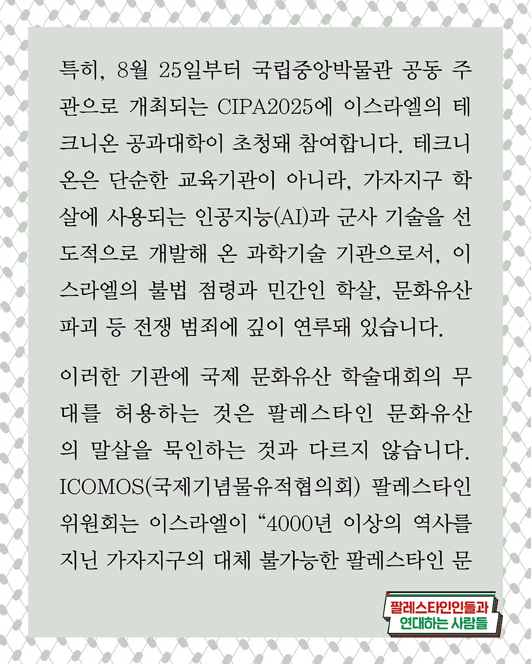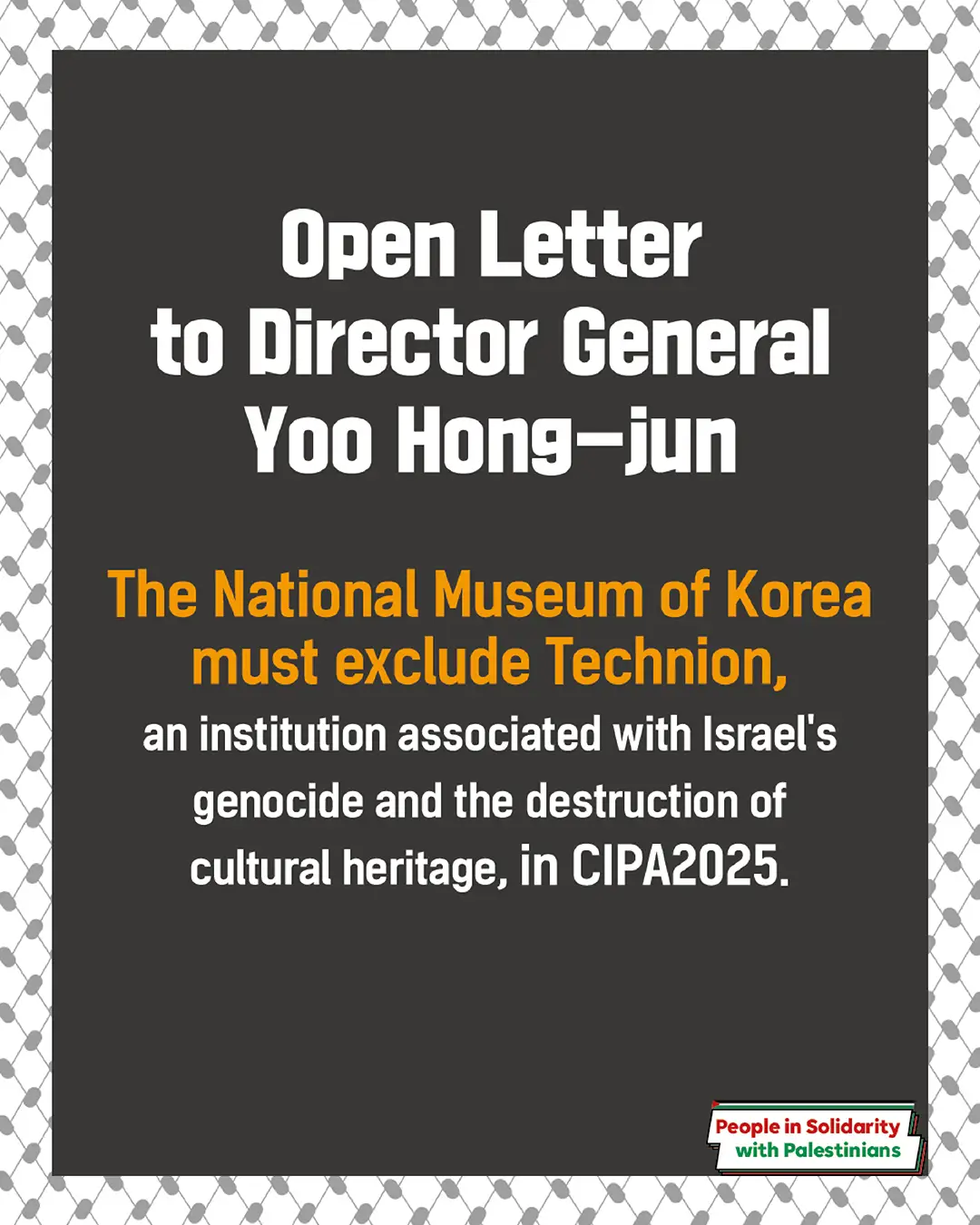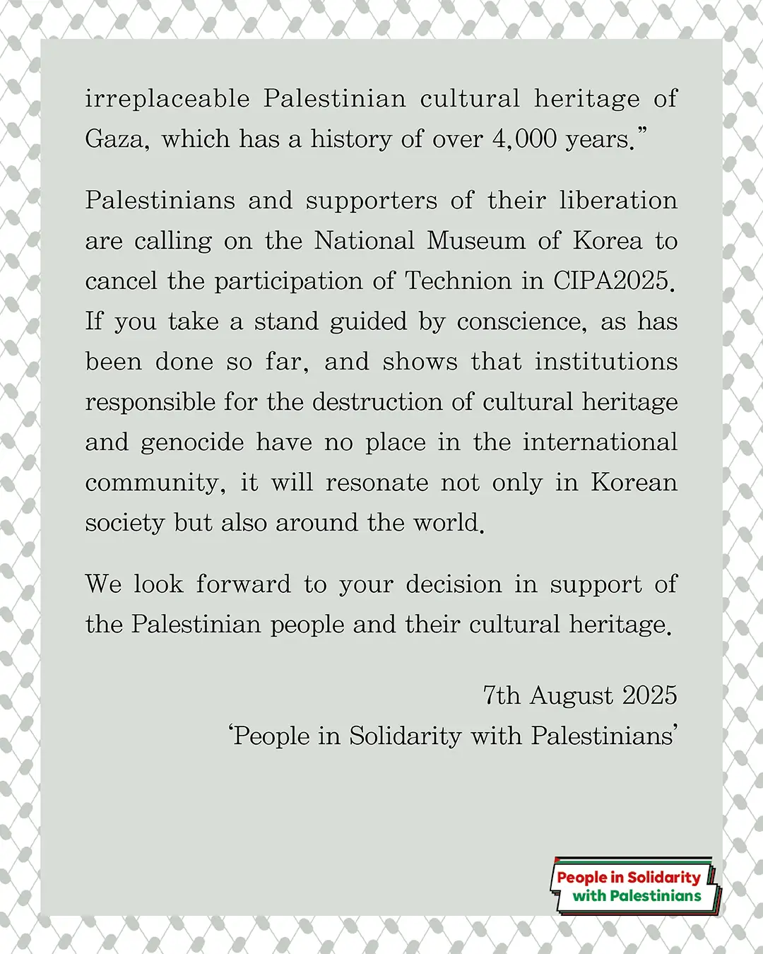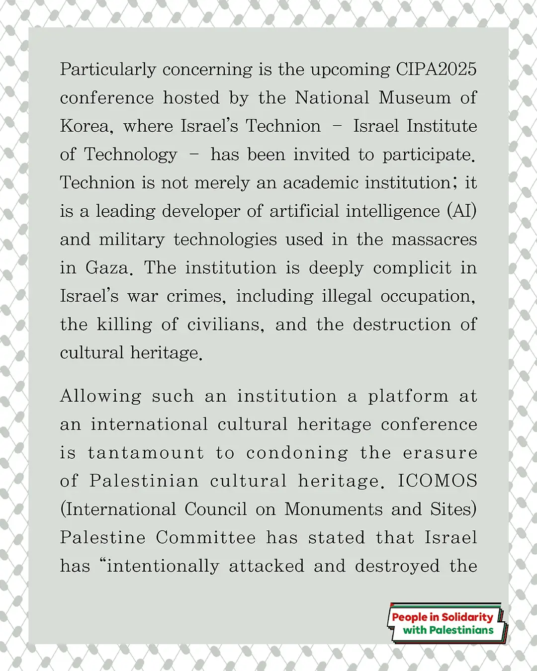 Palestinians and supporters of their liberation are calling on the National Museum of Korea to cancel the participation of Technion in CIPA2025. If you take a stand guided by conscience, as has been done so far, and shows that institutions responsible for the destruction of cultural heritage and genocide have no place in the international community, it will resonate not only in Korean society but also around the world.
