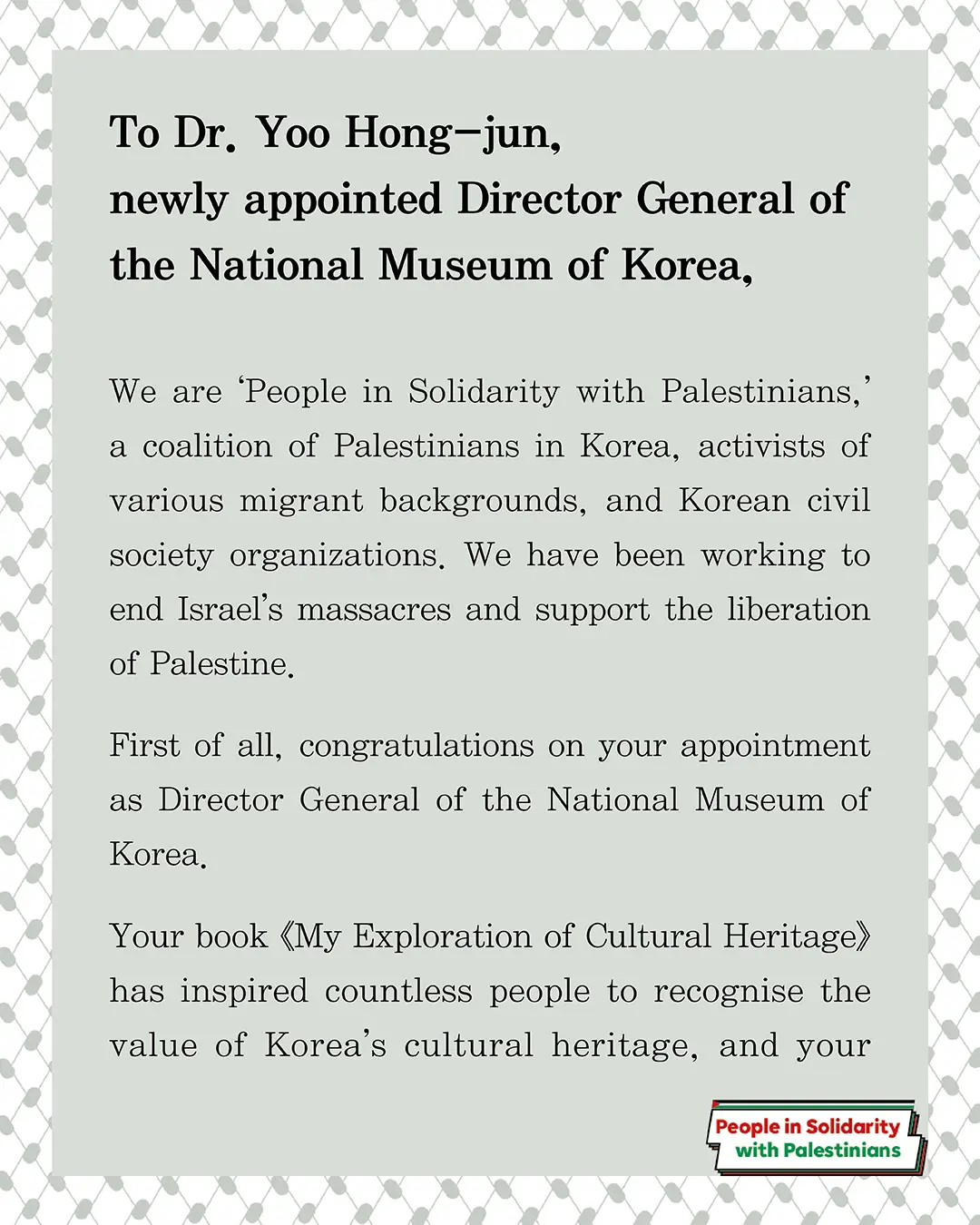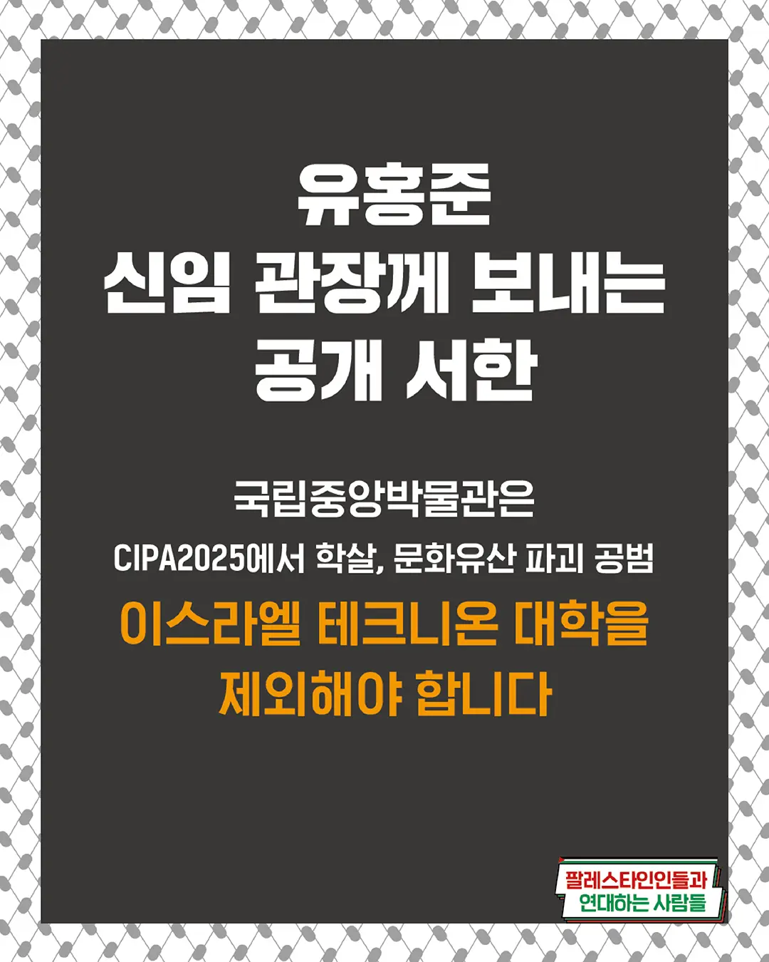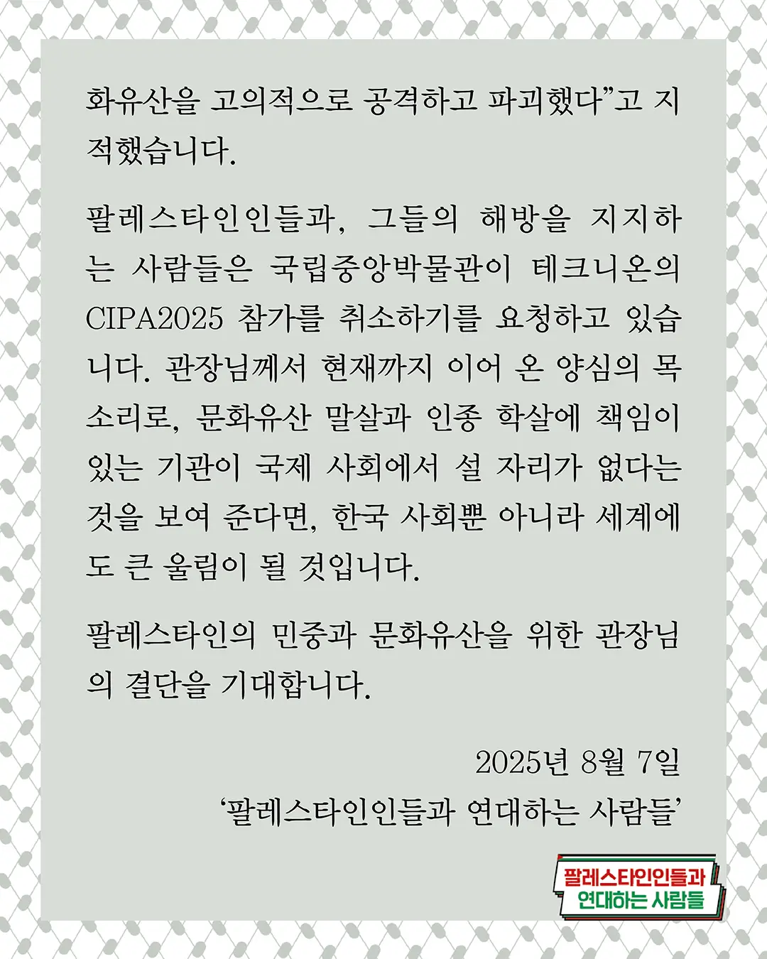 팔레스타인인들과 그들의 해방을 지지하는 사람들은 국립중앙박물관이 테크니온의 CIPA2025 참가를 취소하기를 요청하고 있습니다. 관장님께서 현재까지 이어 온 양심의 목소리로, 문화유산 말살과 인종 학살에 책임이 있는 기관이 국제 사회에서 설 자리가 없다는 것을 보여 준다면, 한국 사회뿐 아니라 세계에도 큰 울림이 될 것입니다.
