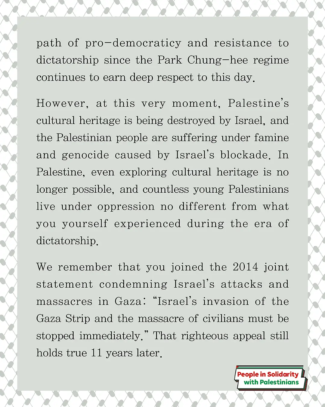 However, at this very moment, Palestine’s cultural heritage is being destroyed by Israel, and the Palestinian people are suffering under famine and genocide caused by Israel’s blockade. In Palestine, even exploring cultural heritage is no longer possible, and countless young Palestinians live under oppression no different from what you yourself experienced during the era of dictatorship.