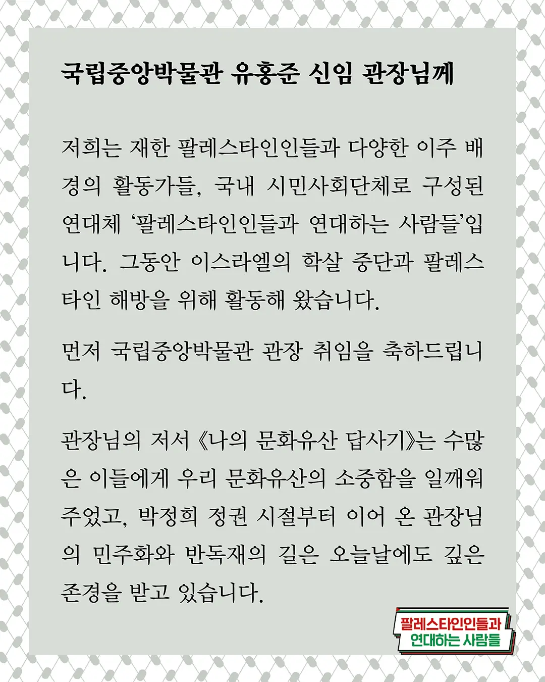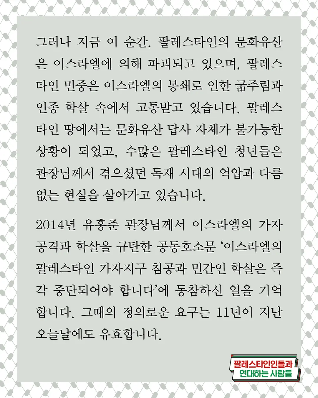 2014년 유홍준 관장님께서 이스라엘의 가자 공격과 학살을 규탄한 공동호소문 ‘이스라엘의 팔레스타인 가자지구 침공과 민간인 학살은 즉각 중단되어야 합니다’에 동참하신 일을 기억합니다. 그때의 정의로운 요구는 11년이 지난 오늘날에도 유효합니다.