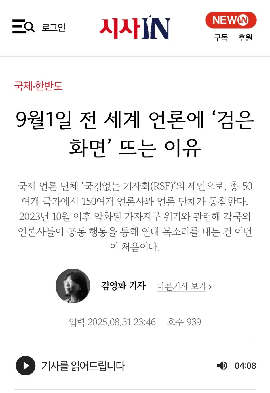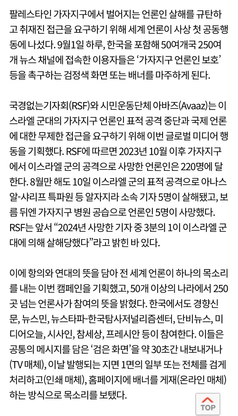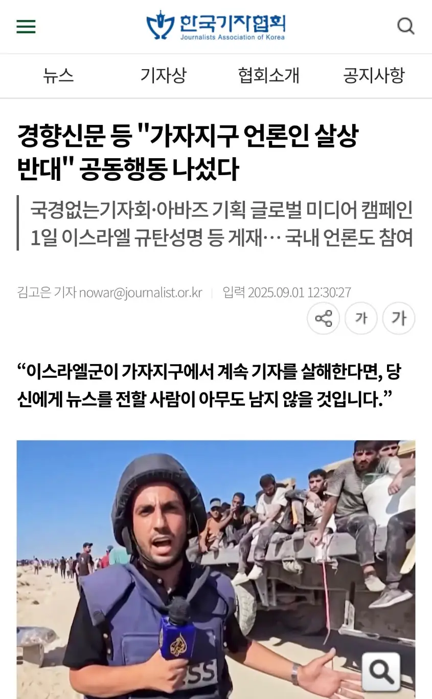 📝 More than 250 media outlets from over 50 countries, including South Korea, have joined an global action condemning Israel’s killing of journalists in Gaza.