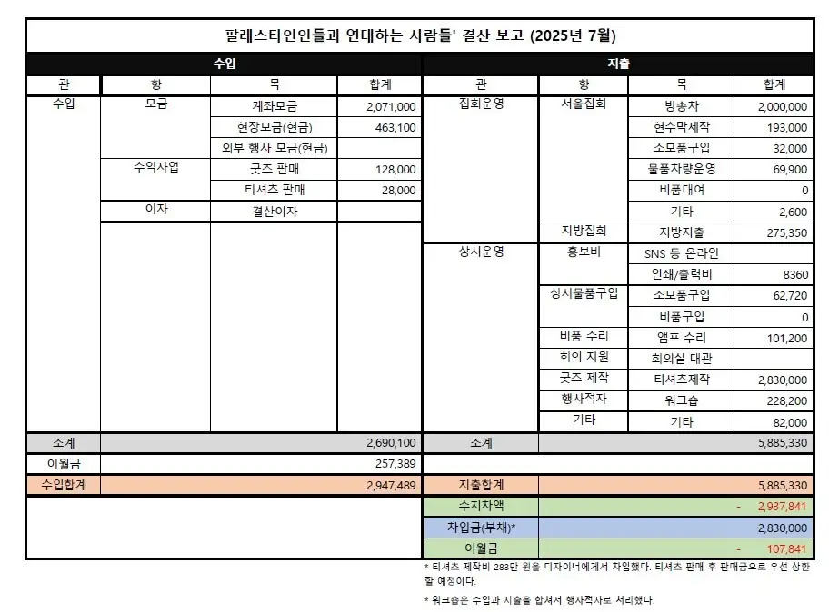 2025년 7월 ‘팔레스타인인들과 연대하는 사람들’ 결산 보고입니다.‘팔연사’ 후원 모금에 함께해주신 모든 분들께 감사드립니다.후원금은 팔레스타인 해방을 위해 소중하게 사용하겠습니다.
