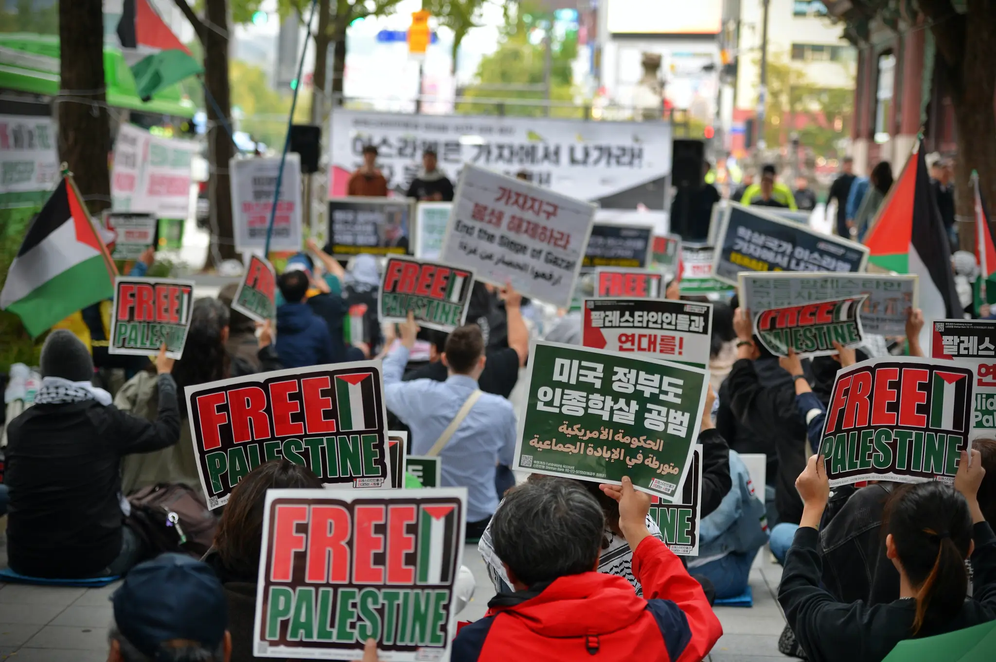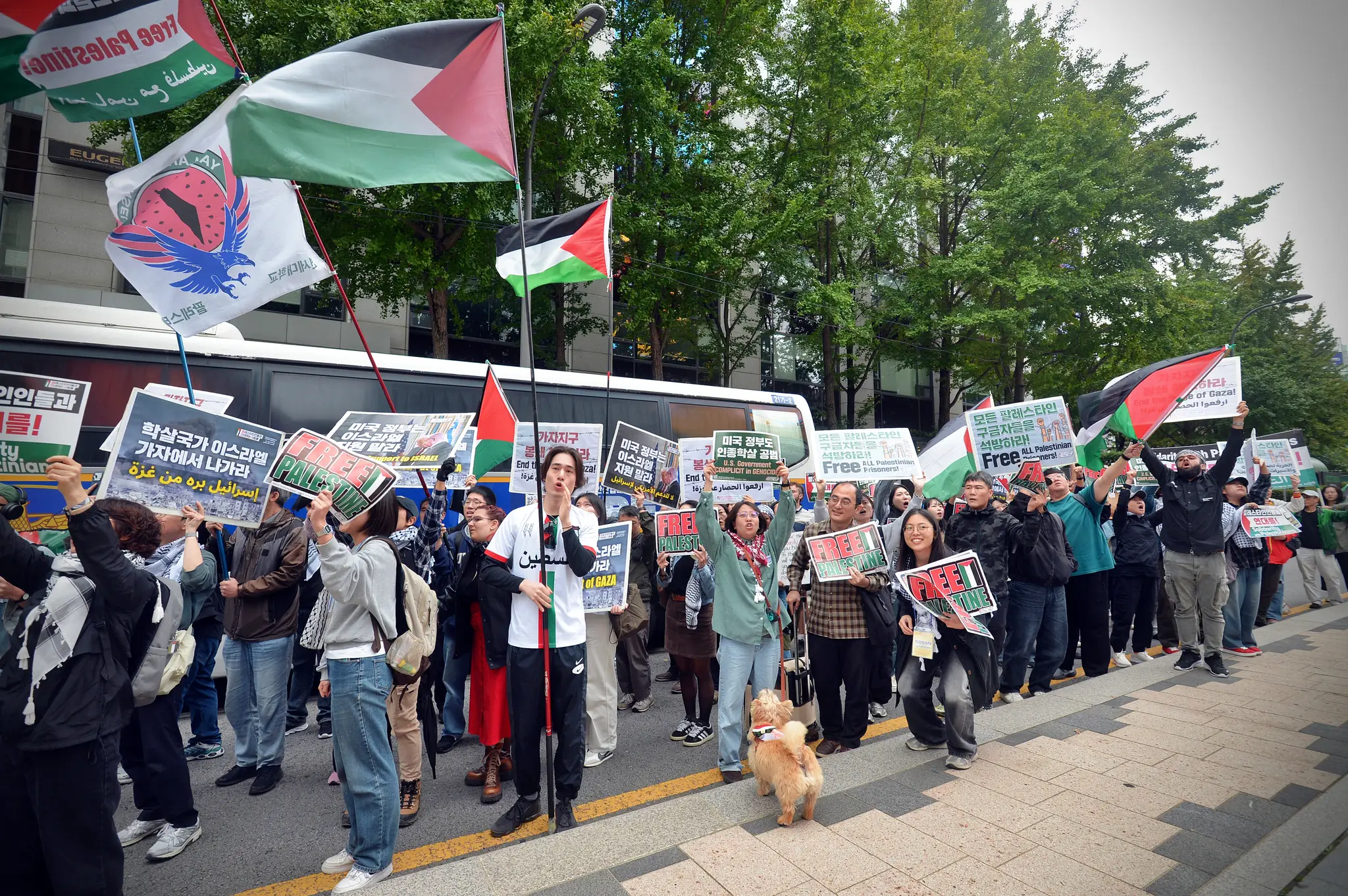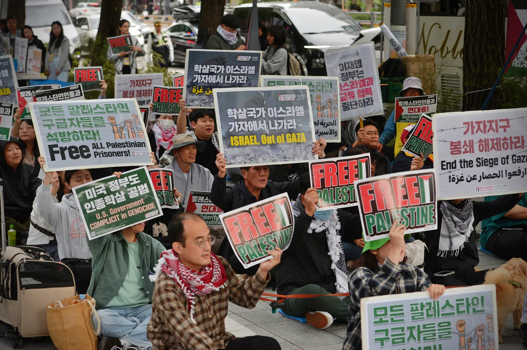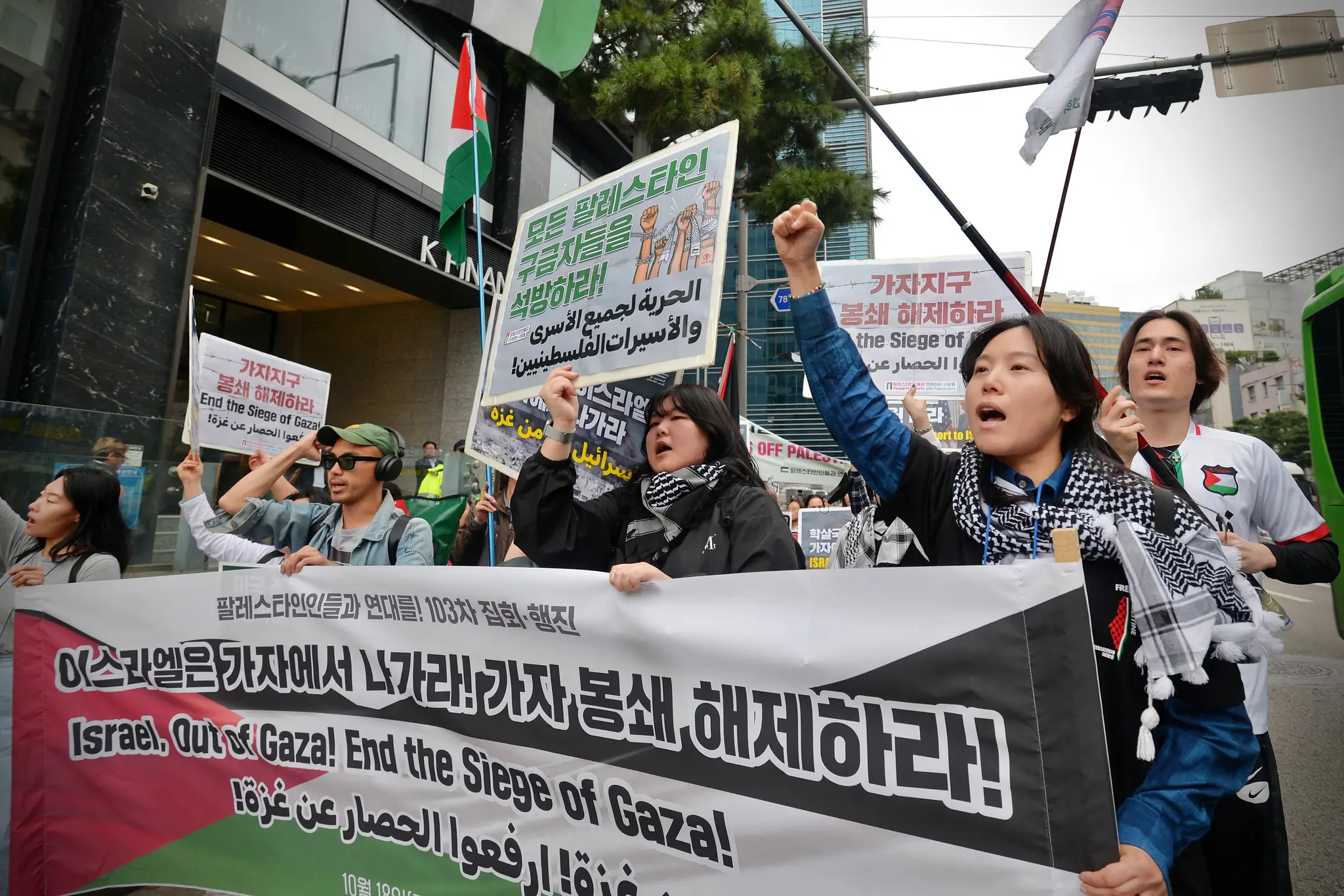 ✌️ 참가자들은 주한 이스라엘 대사관 앞에서 힘껏 이스라엘을 규탄했습니다. “Down Down Israel”, “모든 팔레스타인 구금자를 석방하라(Free All Palestine Prisoners)”