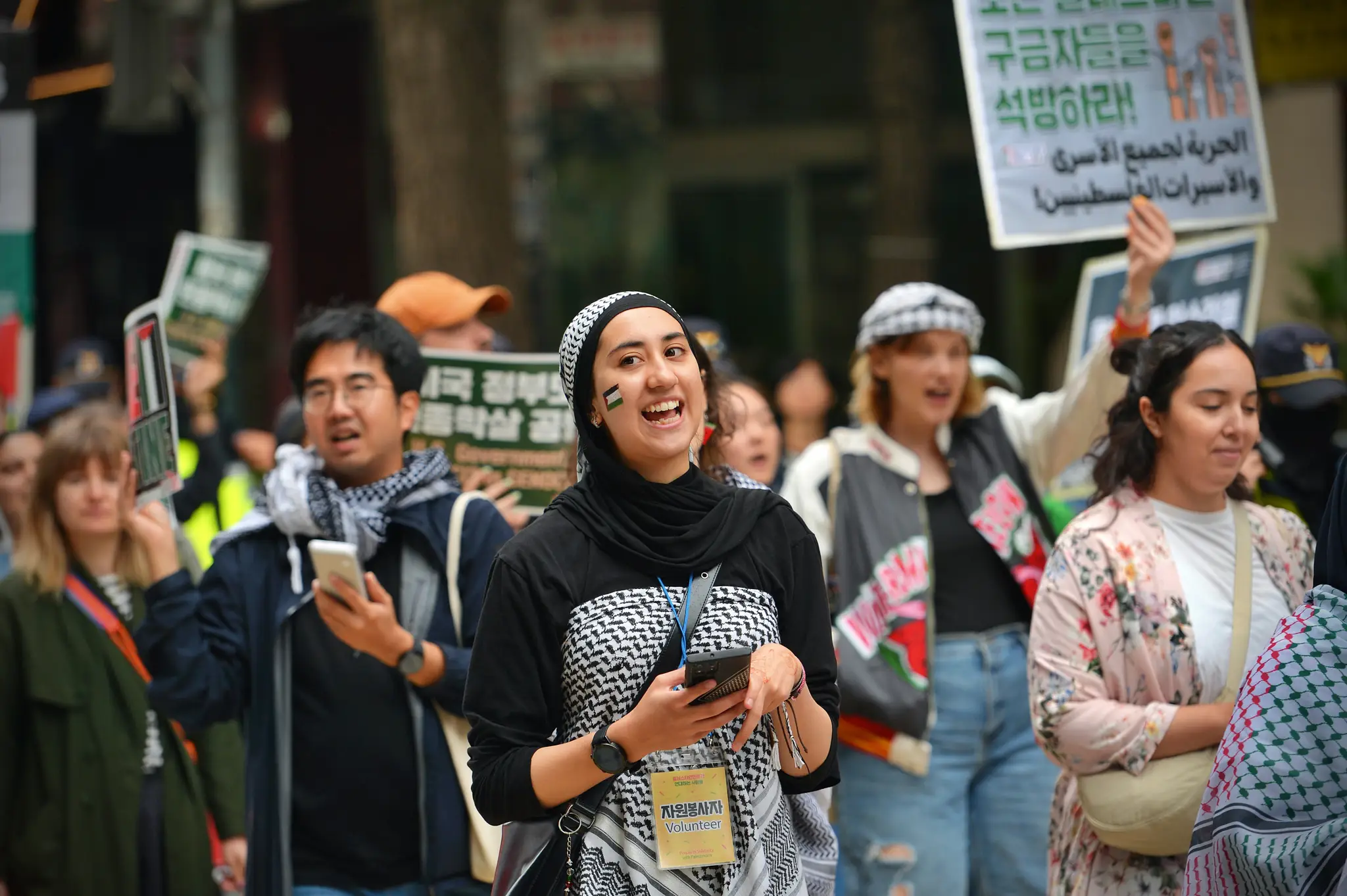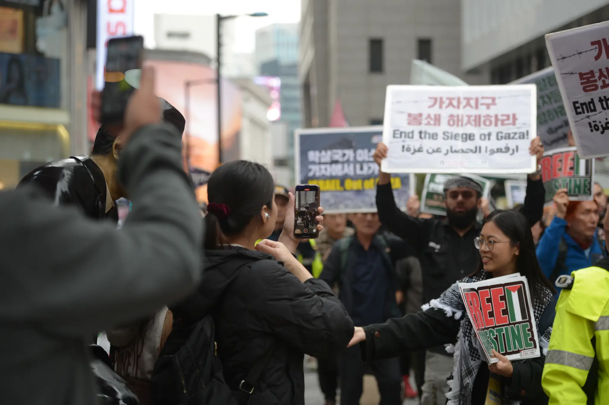 As the march passed through Myeong-dong, Seoul, many pedestrians joined and expressed their solidarity.