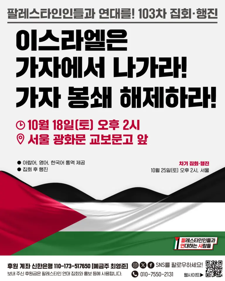🎙 “[10월 18일 집회 당일] 불과 몇 시간 전, 휴전이 발표된 직후 집으로 돌아가던 한 가족이 이스라엘의 폭격으로 전멸했습니다. 단 한순간에 11명이 목숨을 잃었습니다. 그저 전쟁이 끝났다고 믿었을 뿐이었습니다. 이것은 실수가 아니라, 점령의 거짓을 드러내는 새로운 범죄입니다.”