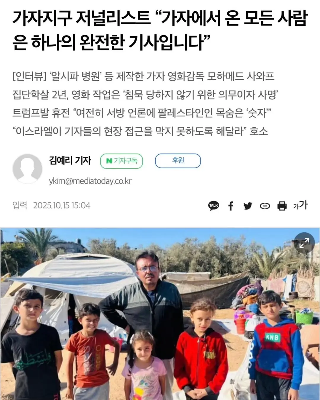 🎬’팔연사’에 꾸준히 가자 소식을 전해 주시는 현지 기자이자 영화감독인 무함마드 사와프 님이 <미디어오늘>과 인터뷰한 기사, 일독을 권합니다. 휴전 이후에도 “이스라엘군이 여전히 많은 지역(가자지구의 53%)을 점령하고 있어 대부분이 자기 동네로 돌아가지 못하는 현실”을 전하셨습니다.