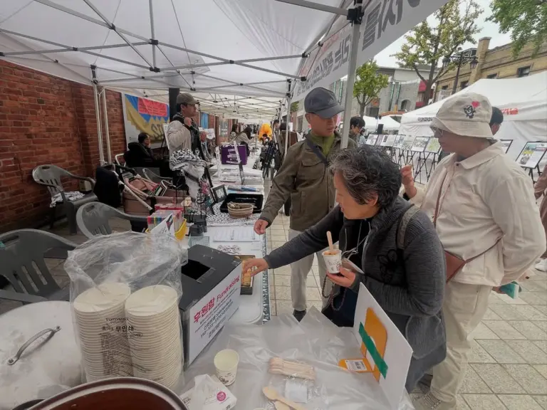 축제 공연자로 온 스페인 가수 분도 부스에 오셔서 함께 인증샷을 찍어주시고 스페인어로 Viva Palestina, Libre Palestina 등을 알려주시면서 연대 총파업 이야기도 들려주셨어요. 자신의 친구도 참여했었다고^^