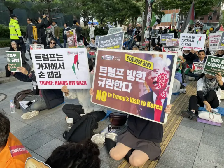 👎 우리는 이런 자가 한국 땅을 밟는 것을 규탄합니다. “학살 공범 도널드 트럼프, 가자에서 손 떼라!”, “학살 공범 도널드 트럼프, 한국에 오지마!”
