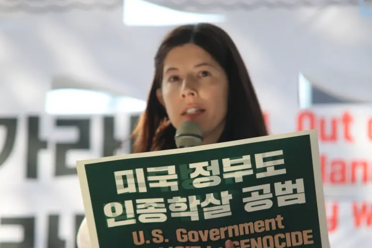 “Donald Trump, accomplice to genocide — You are not welcome in Korea!”