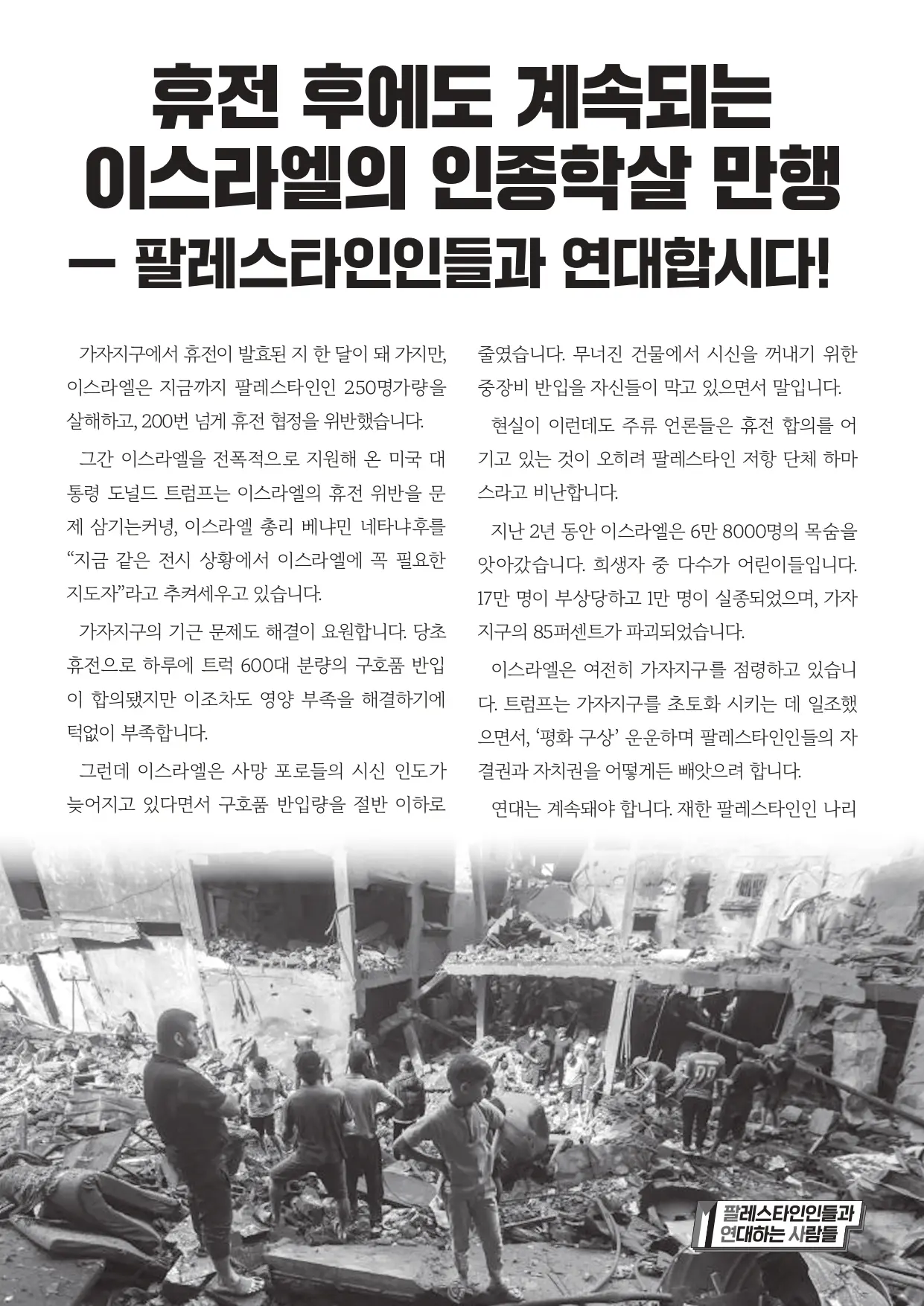 [리플릿] 휴전 후에도 계속되는 이스라엘의 인종학살 만행 — 팔레스타인인들과 연대합시다!