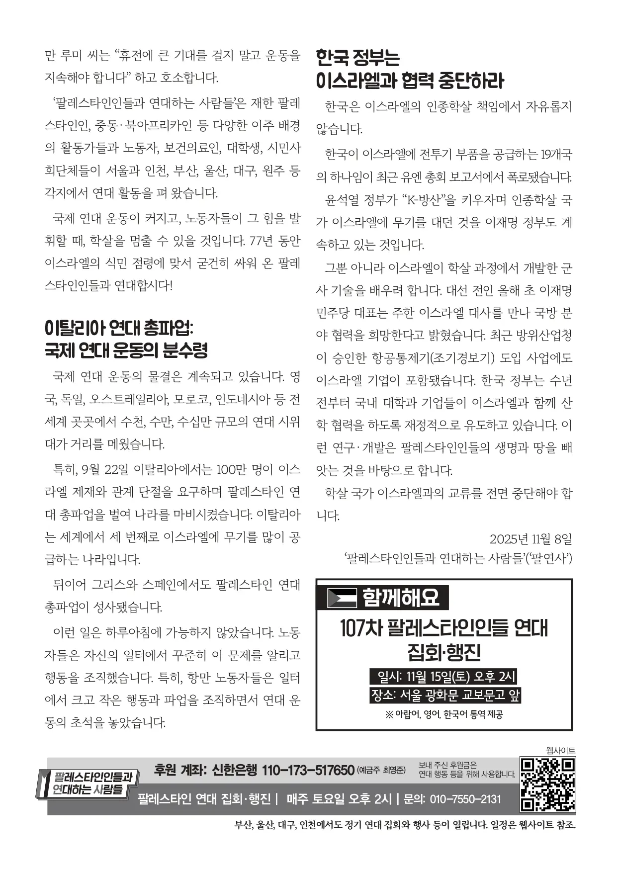 11월 8일 팔연사는 106차 팔레스타인 연대 집회 후 인근에서 열리는 ‘전국노동자대회’로 행진합니다. 전국노동자대회는 매해 대규모로 열리는 대표적 노동자 집회로, 연대와 투쟁의 장입니다. 팔연사는 전국노동자대회 참가자들에게 팔레스타인인들과의 연대를 호소하는 다음의 리플릿을 반포합니다.