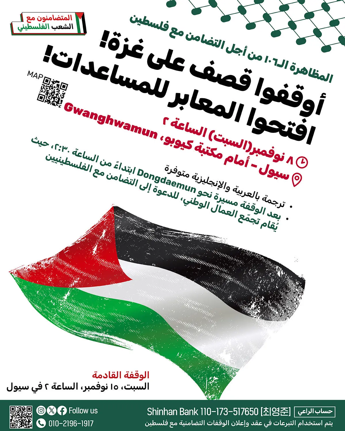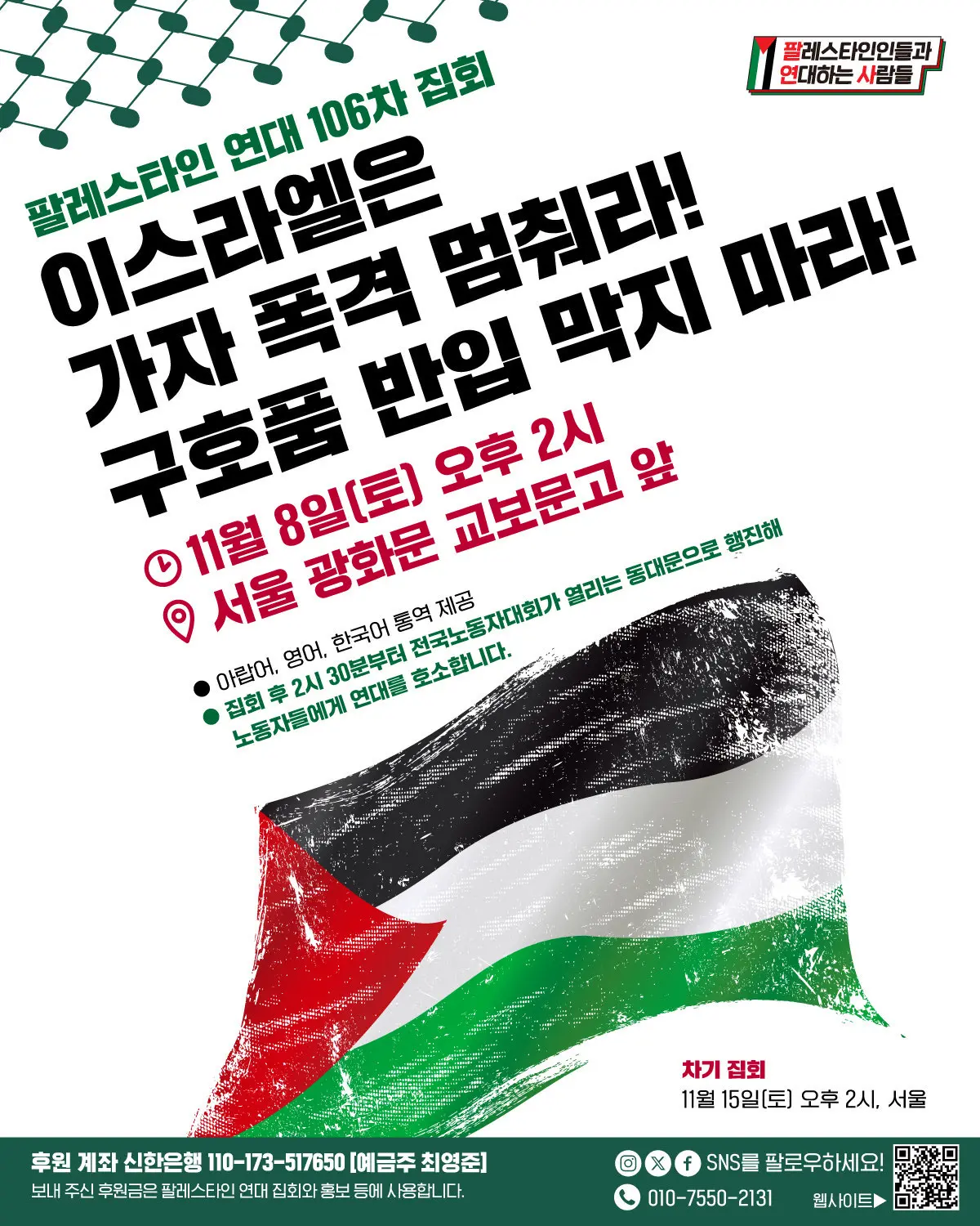 👊 ‘팔레스타인인들과 연대하는 사람들'(팔연사)은 한국 최대 규모 노동자 집회인 ‘전국노동자대회’에 참가해 팔레스타인인들과 연대를 호소했습니다.