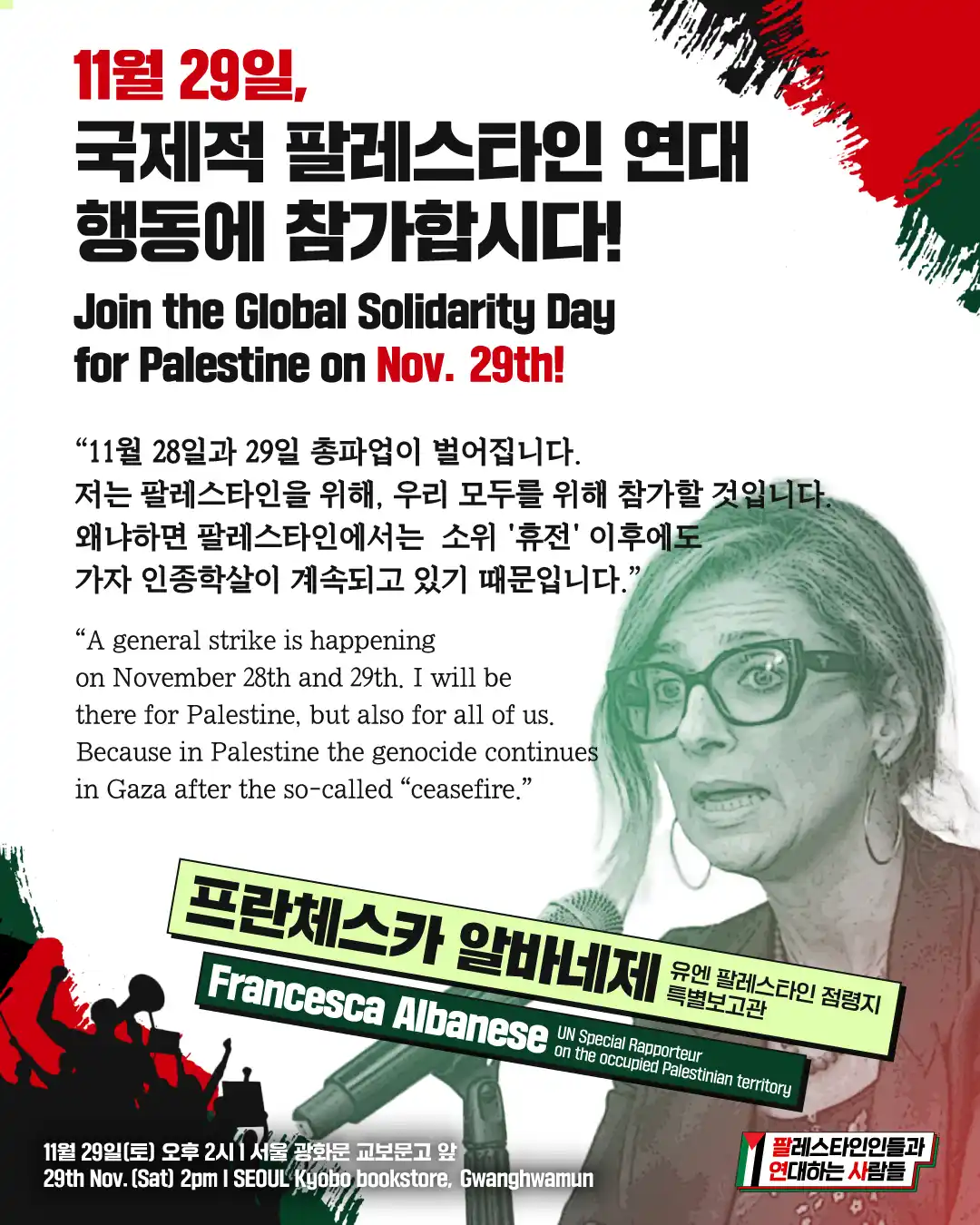프란체스카 알바네제(유엔 팔레스타인 점령지 특별보고관), “11월 29일, 국제적 팔레스타인 연대 행동에 참가합시다!”