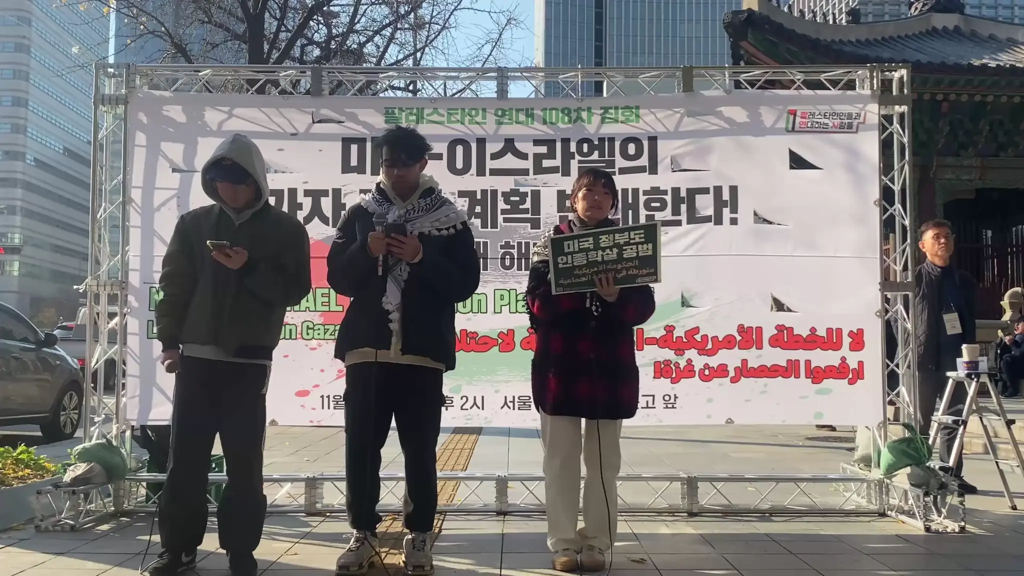 가자지구 팔레스타인인이 보내 온 메시지를 사회자가 낭독하고 이를 한국어, 영어로 통역했다