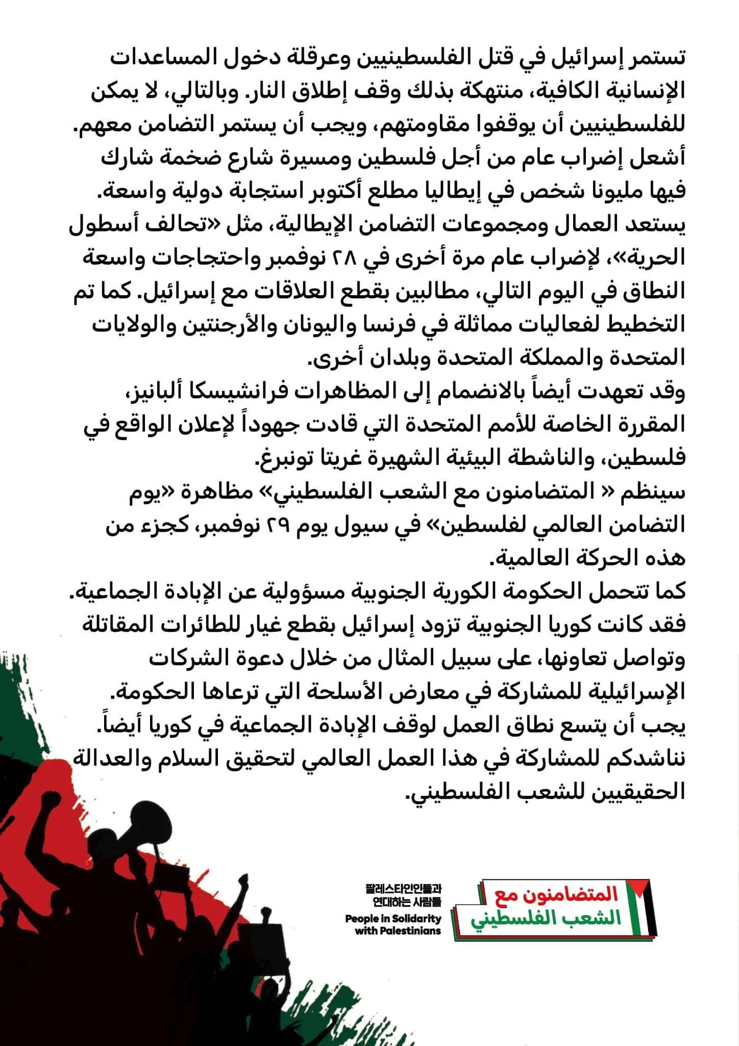 ✊ 이탈리아 노동자들의 파업과 대규모 시위를 비롯해 미국·영국·아르헨티나·그리스 등 여러 나라에서 진행된 ‘국제 행동의 날’은 전 세계 평화와 희망을 대표하는 팔레스타인인들의 목소리를 다시 한 번 크게 울려 퍼지게 했습니다.