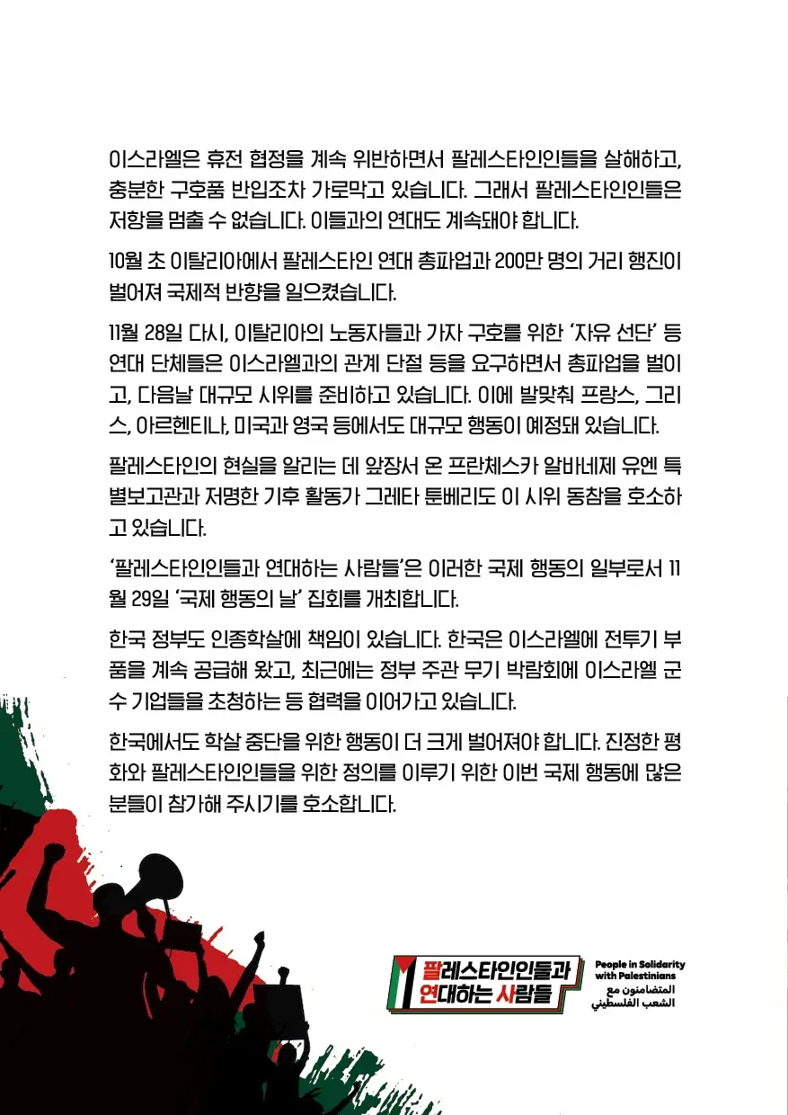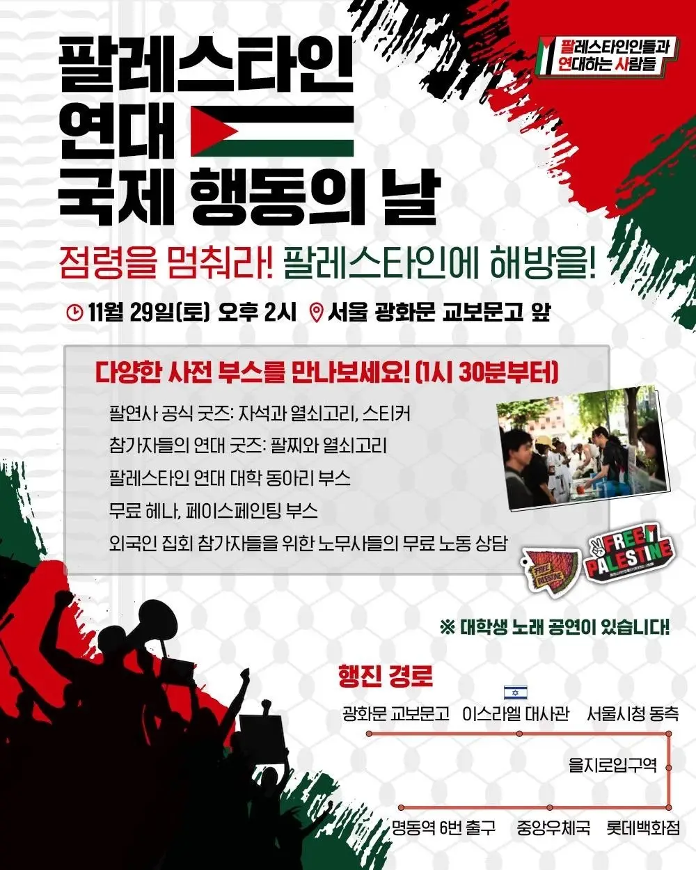 🇵🇸 11월 29일, 한국에서도 열린 ‘팔레스타인 연대 국제 행동의 날’에 많은 사람들이 모여 연대의 힘을 보여주었습니다.