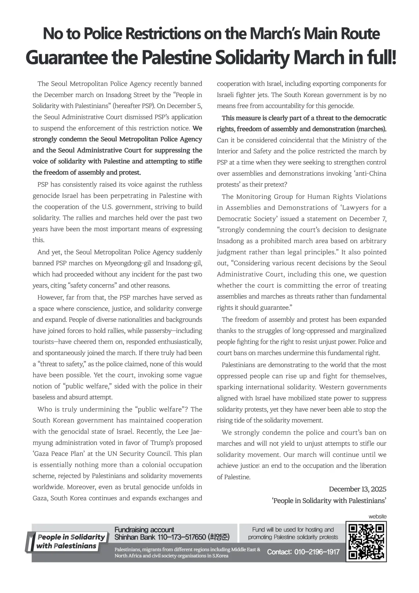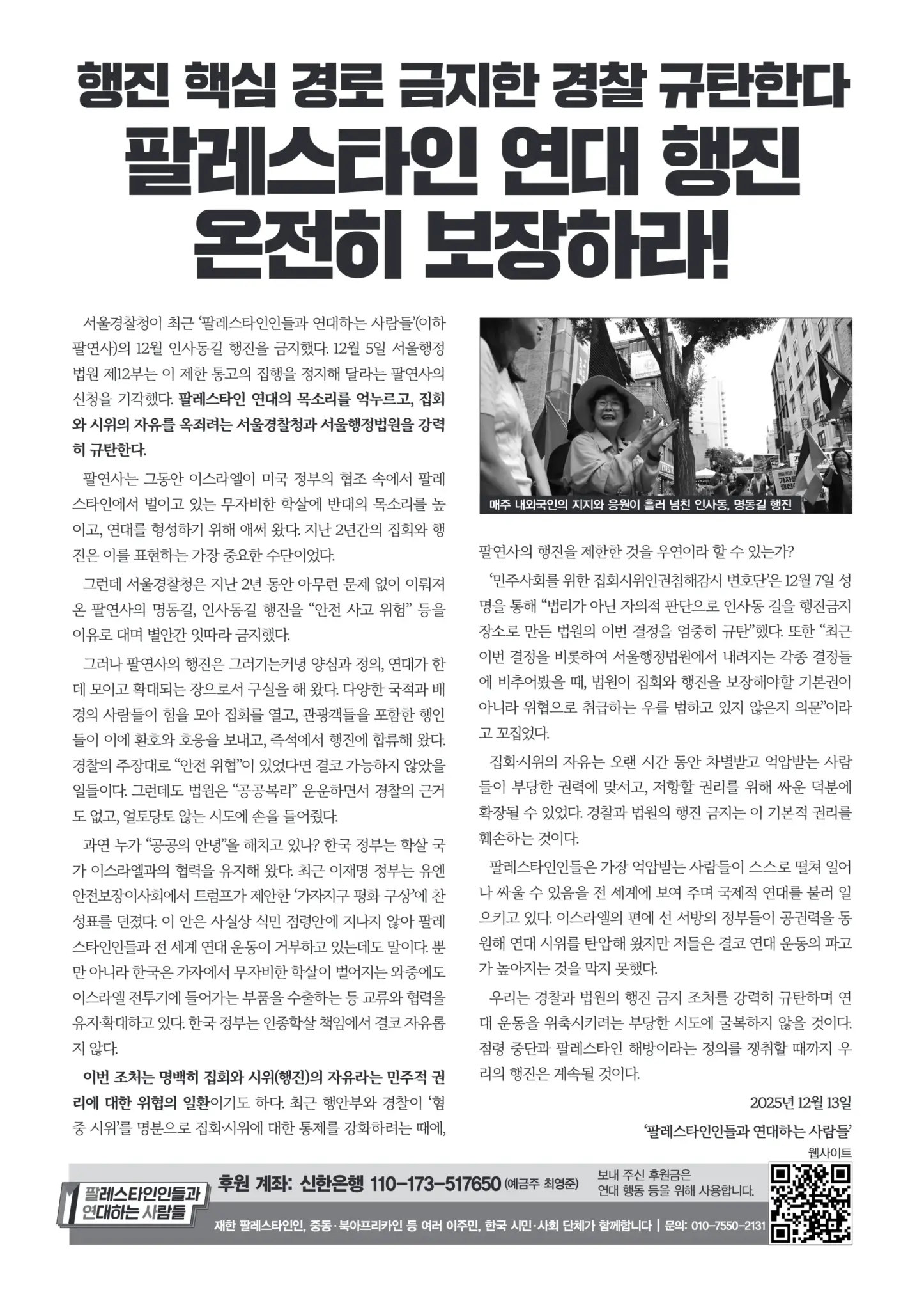 [리플릿] 행진 핵심 경로 금지한 경찰 규탄한다: 팔레스타인 연대 행진 온전히 보장하라!