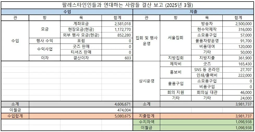 2025년 3월 ‘팔레스타인인들과 연대하는 사람들’ 결산 보고입니다.‘팔연사’ 후원 모금에 함께해주신 모든 분들께 감사드립니다.후원금은 팔레스타인 해방을 위해 소중하게 사용하겠습니다.