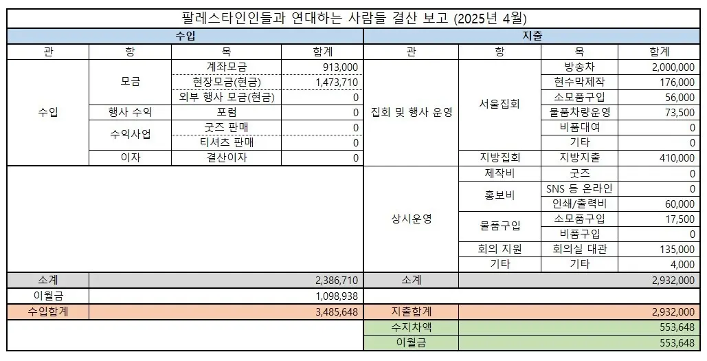 2025년 4월 ‘팔레스타인인들과 연대하는 사람들’ 결산 보고입니다.‘팔연사’ 후원 모금에 함께해주신 모든 분들께 감사드립니다.후원금은 팔레스타인 해방을 위해 소중하게 사용하겠습니다.
