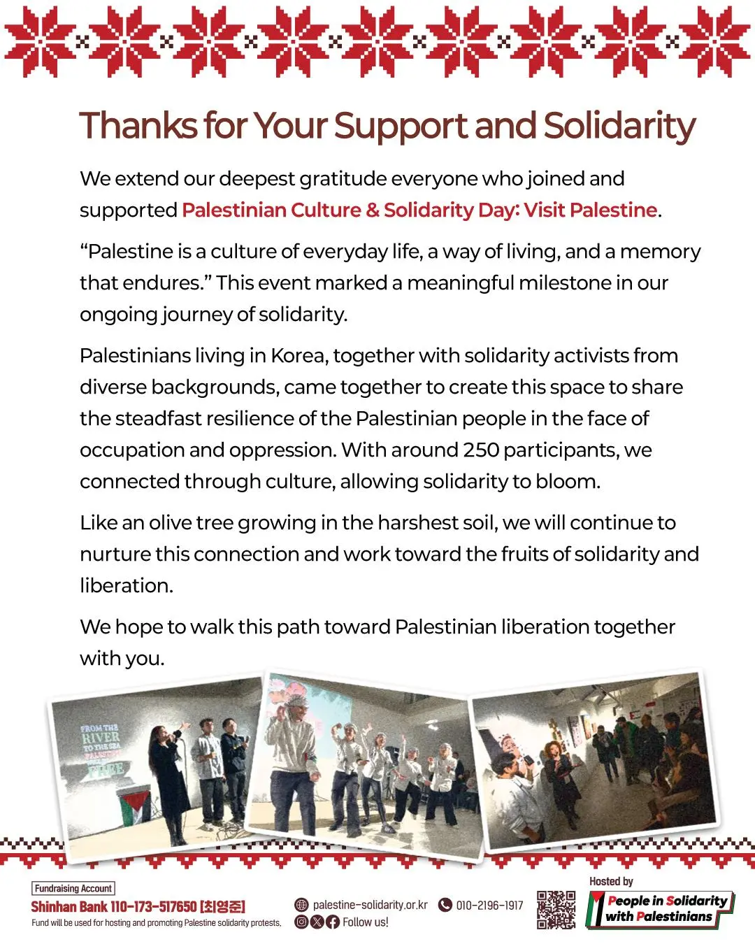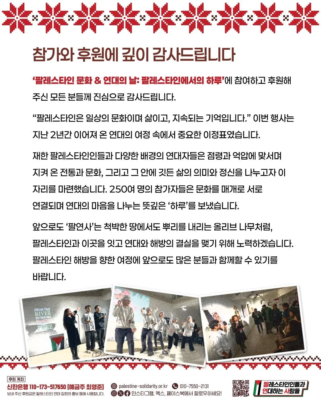 ‘팔레스타인 문화 & 연대의 날: 팔레스타인에서의 하루’에 참여하고 후원해 주신 모든 분들께 진심으로 감사드립니다.