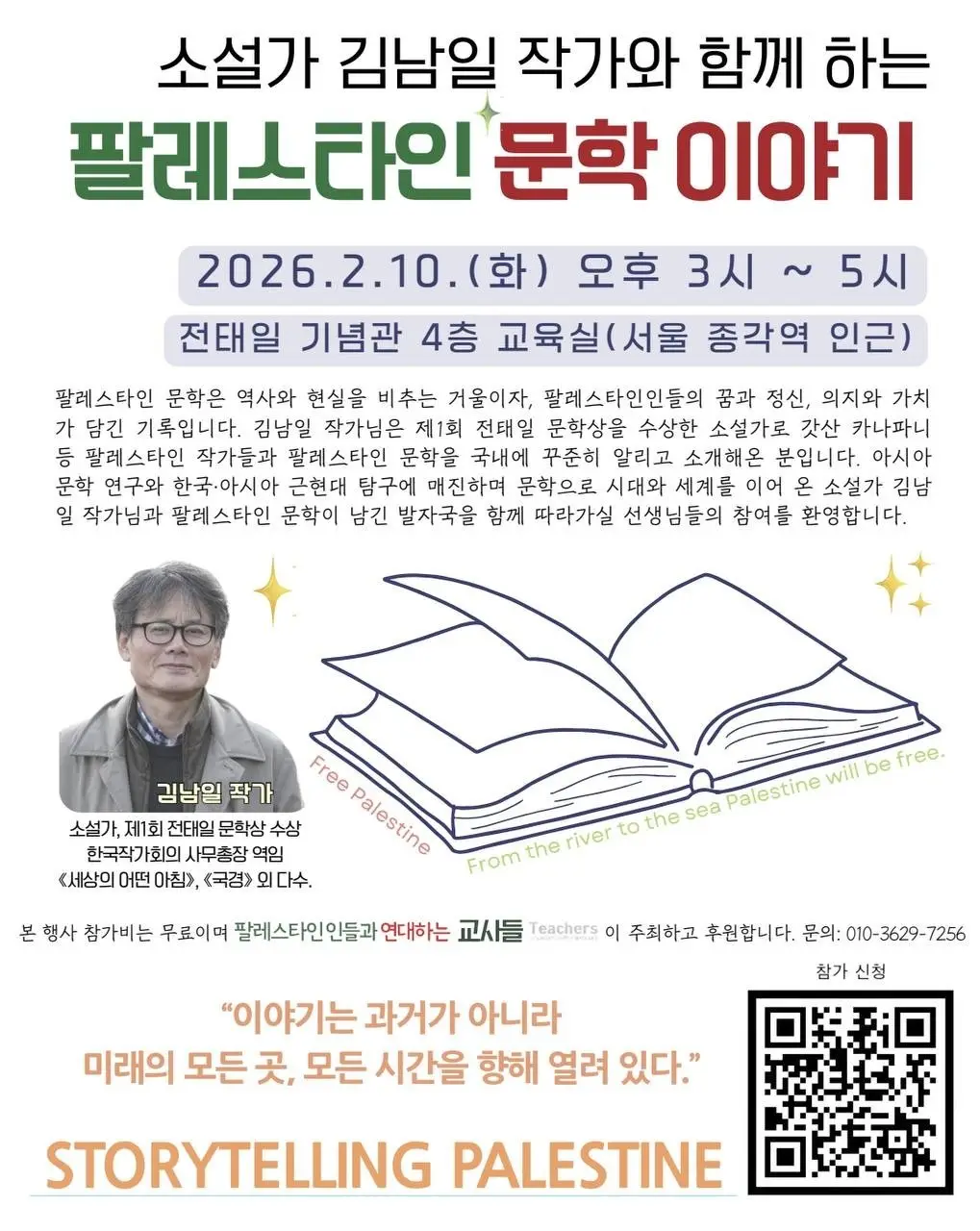 νŒ”λ ˆμŠ€νƒ€μΈ 문학은 역사와 ν˜„μ‹€μ„ λΉ„μΆ”λŠ” 거울이자, νŒ”λ ˆμŠ€νƒ€μΈμΈλ“€μ˜ 꿈과 μ •μ‹ , μ˜μ§€μ™€ κ°€μΉ˜κ°€ λ‹΄κΈ΄ κΈ°λ‘μž…λ‹ˆλ‹€. 김남일 μž‘κ°€λ‹˜μ€ 제1회 μ „νƒœμΌ 문학상을 μˆ˜μƒν•œ μ†Œμ„€κ°€λ‘œ κ°“μ‚° μΉ΄λ‚˜νŒŒλ‹ˆ λ“± νŒ”λ ˆμŠ€νƒ€μΈ μž‘κ°€λ“€κ³Ό νŒ”λ ˆμŠ€νƒ€μΈ 문학을 ꡭ내에 κΎΈμ€€νžˆ μ•Œλ¦¬κ³  μ†Œκ°œν•΄μ˜¨ λΆ„μž…λ‹ˆλ‹€. μ•„μ‹œμ•„ λ¬Έν•™ 연ꡬ와 ν•œκ΅­Β·μ•„μ‹œμ•„ κ·Όν˜„λŒ€ 탐ꡬ에 λ§€μ§„ν•˜λ©° λ¬Έν•™μœΌλ‘œ μ‹œλŒ€μ™€ 세계λ₯Ό 이어 온 μ†Œμ„€κ°€ 김남일 μž‘κ°€λ‹˜κ³Ό νŒ”λ ˆμŠ€νƒ€μΈ 문학이 남긴 λ°œμžκ΅­μ„ ν•¨κ»˜ 따라가싀 μ„ μƒλ‹˜λ“€μ˜ μ°Έμ—¬λ₯Ό ν™˜μ˜ν•©λ‹ˆλ‹€.