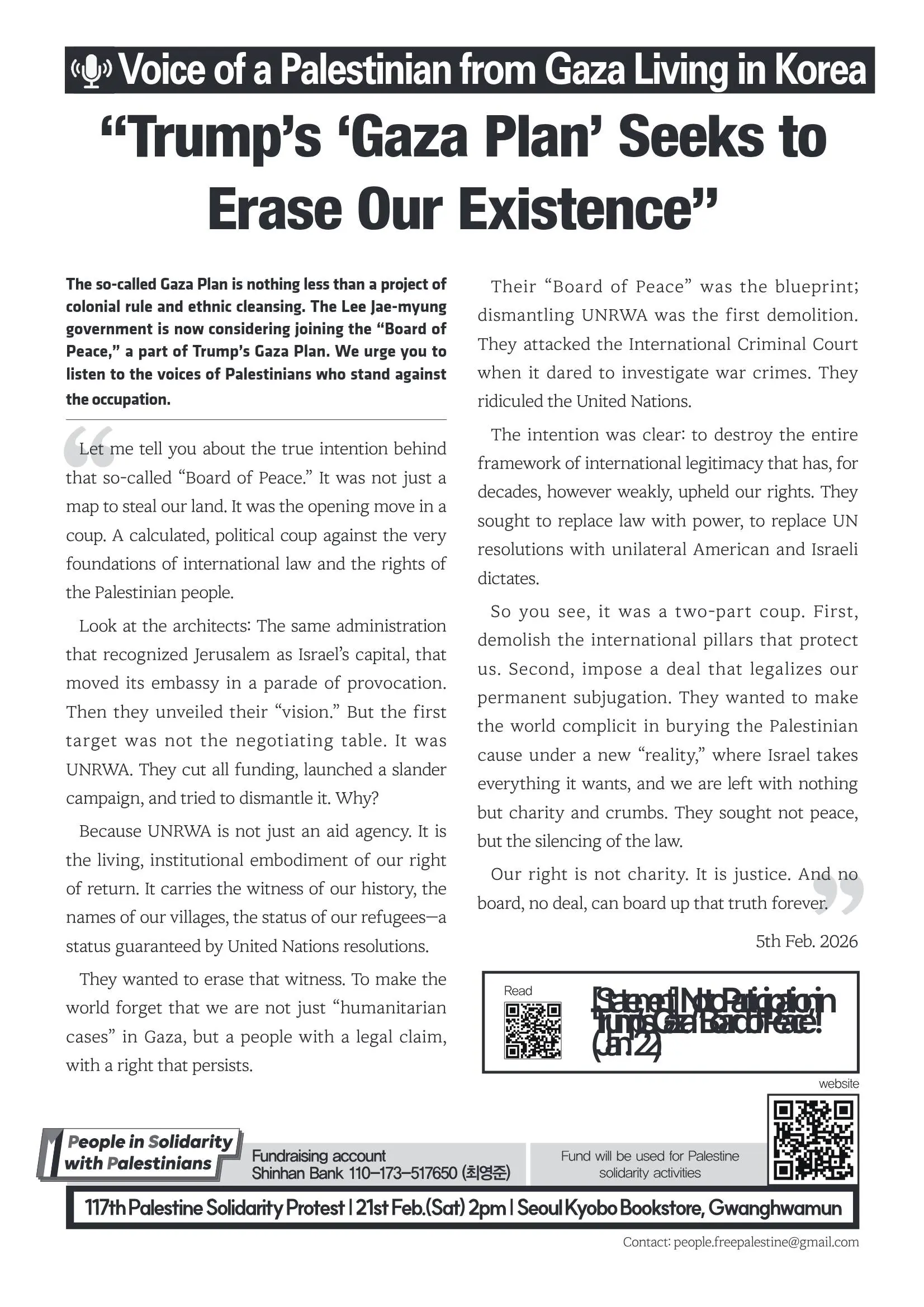 [Leaflet] Voice of a Palestinian from Gaza Living in Korea: “Trump’s ‘Gaza Plan’ Seeks to Erase Our Existence”