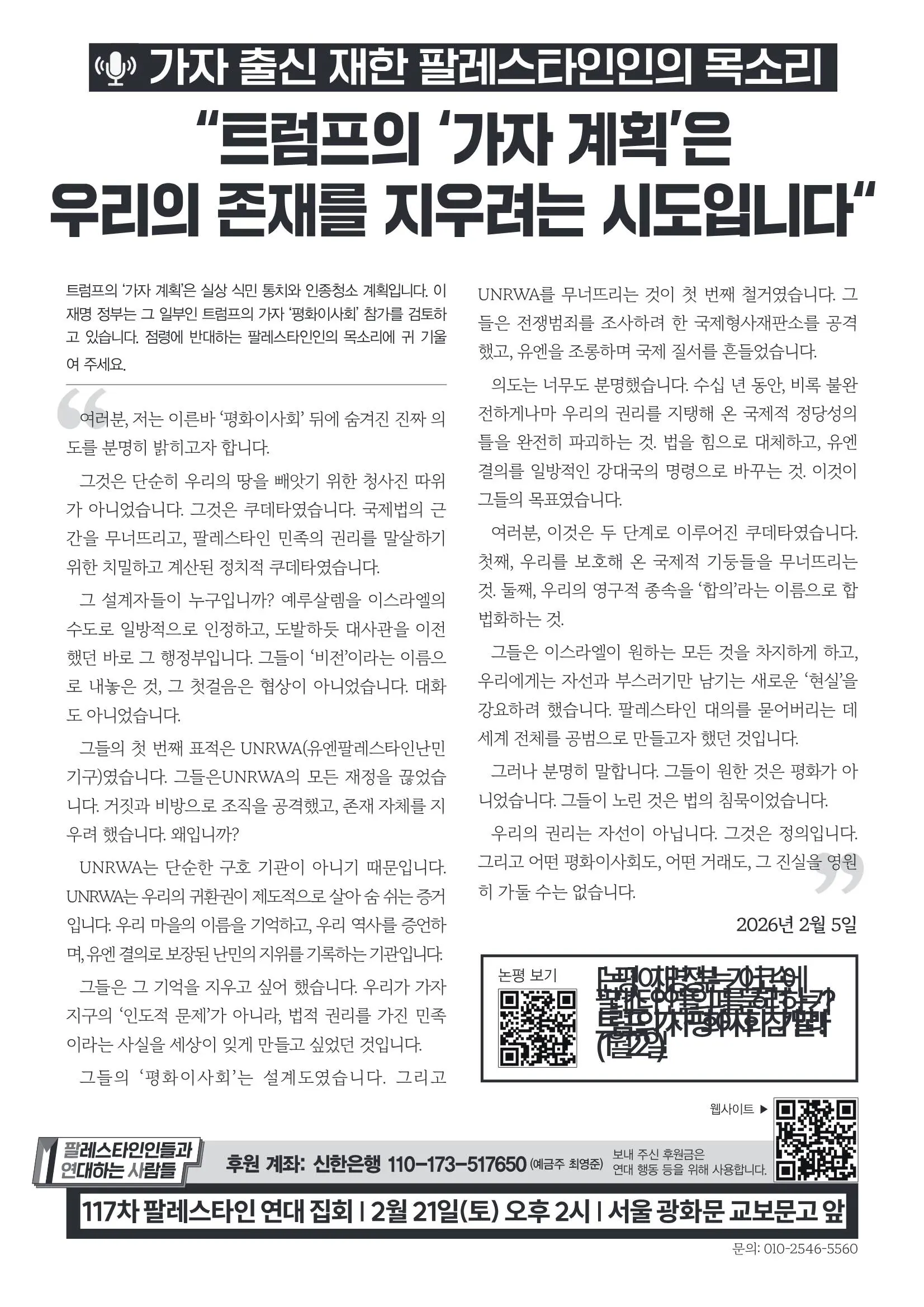 [리플릿] 가자 출신 재한 팔레스타인인의 목소리: “트럼프의 ‘가자 계획’은 우리의 존재를 지우려는 시도입니다”