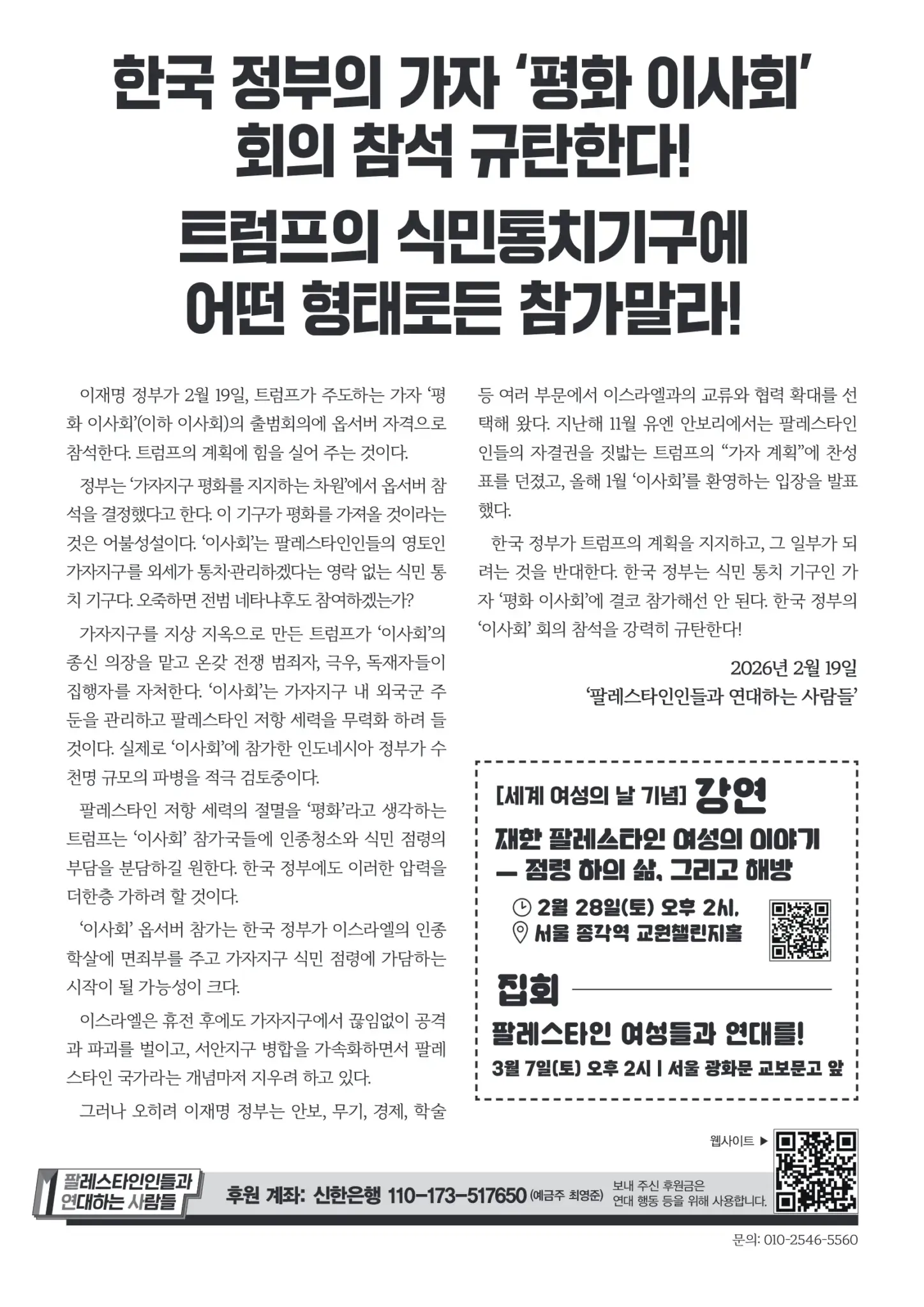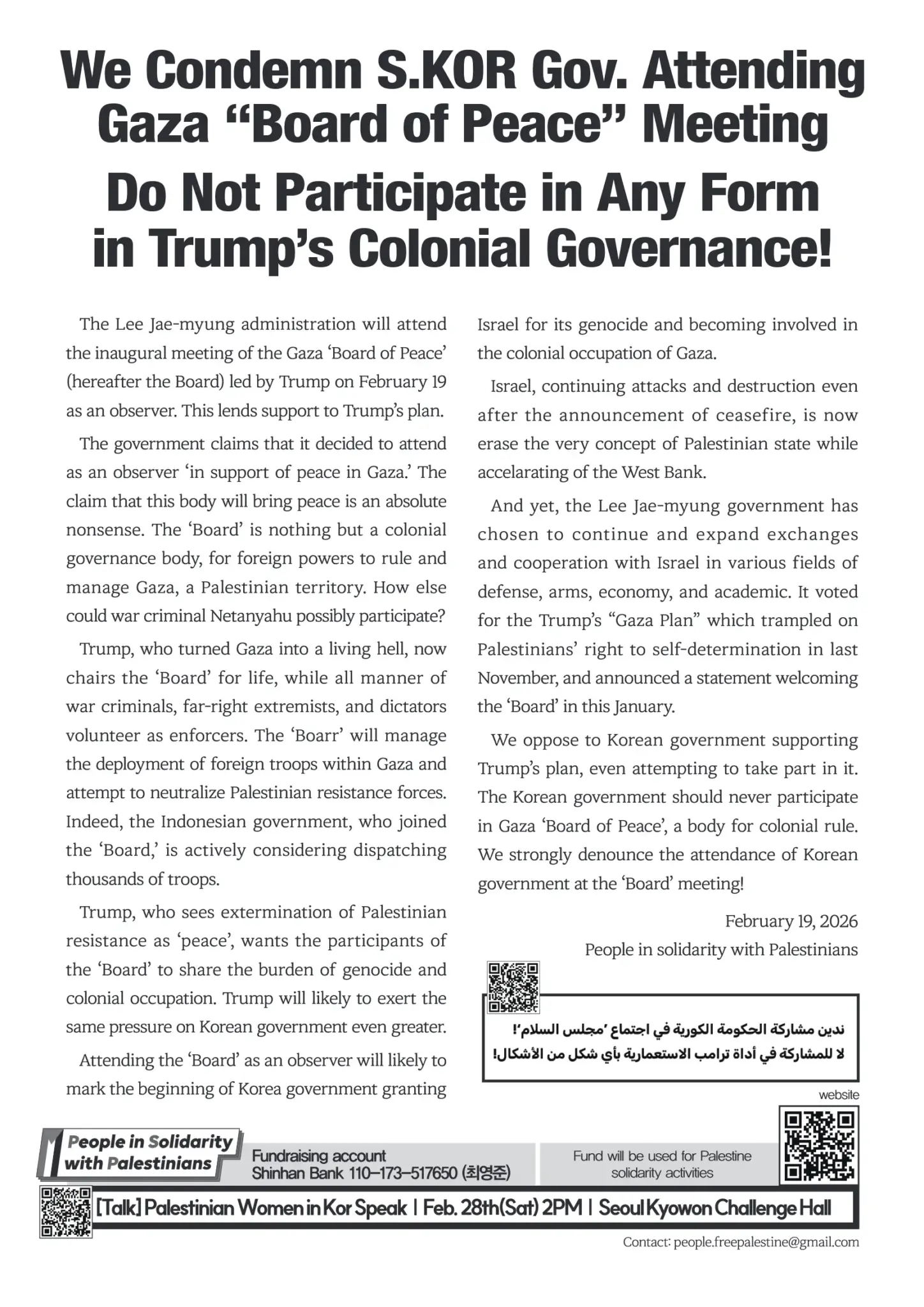 [Leaflet] We Condemn S.KOR Gov. Attending Gaza “Board of Peace” Meeting / Do Not Participate in Any Form in Trump’s Colonial Governance!