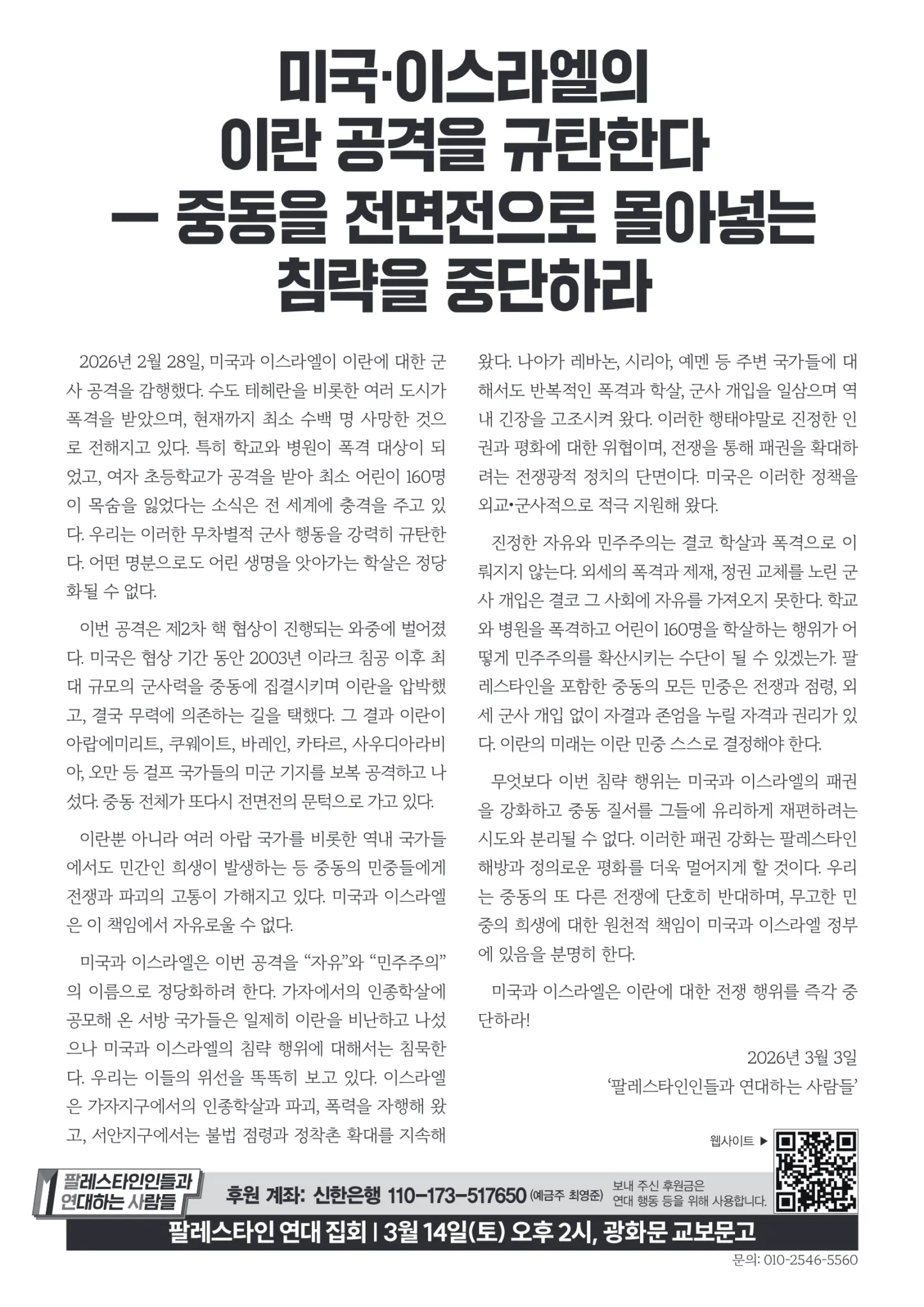 [리플릿] 미국·이스라엘의 이란 공격을 규탄한다 ― 중동을 전면전으로 몰아넣는 침략을 중단하라
