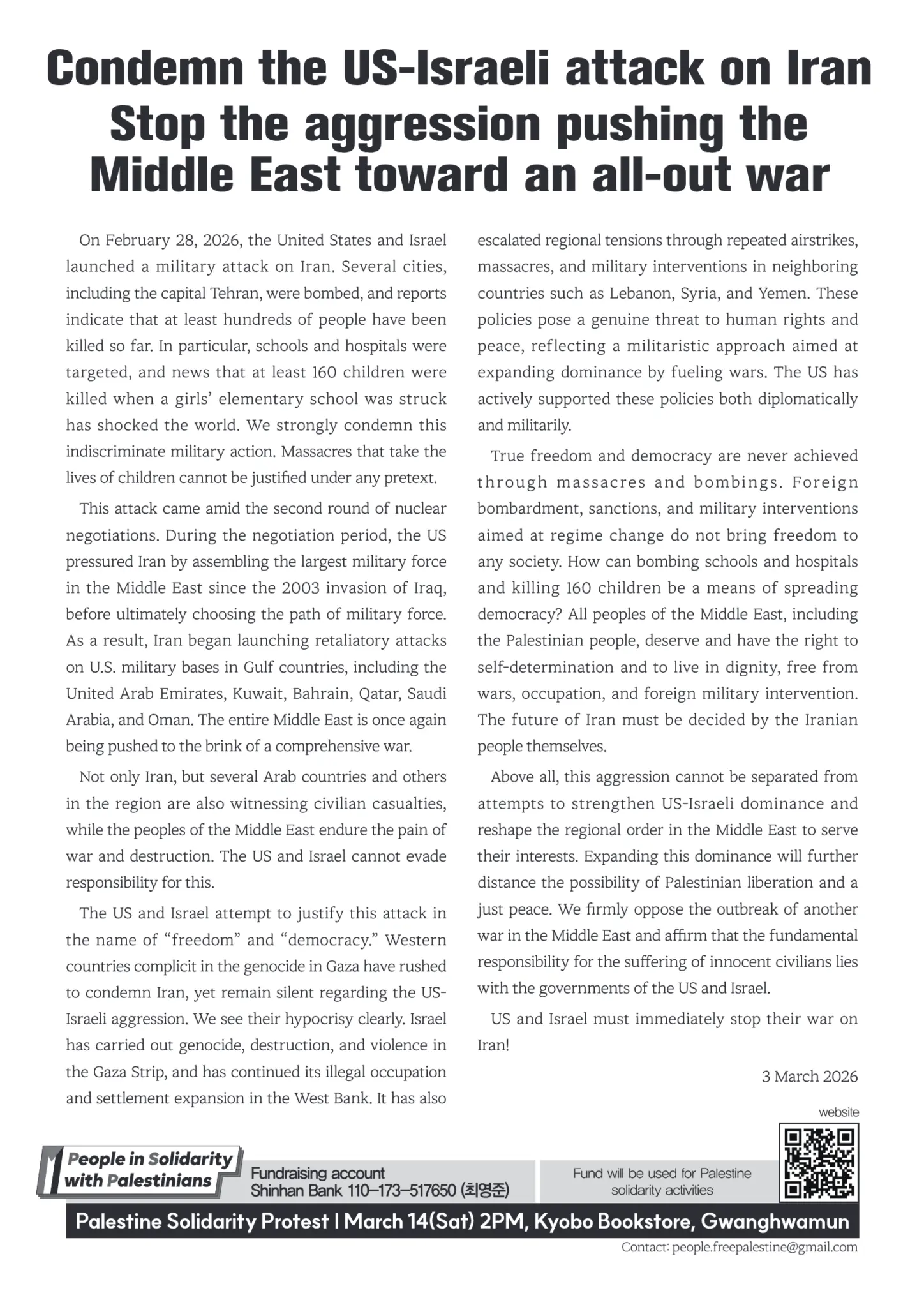 [Leaflet] Condemn the US-Israeli attack on Iran Stop the aggression pushing the Middle East toward an all-out war