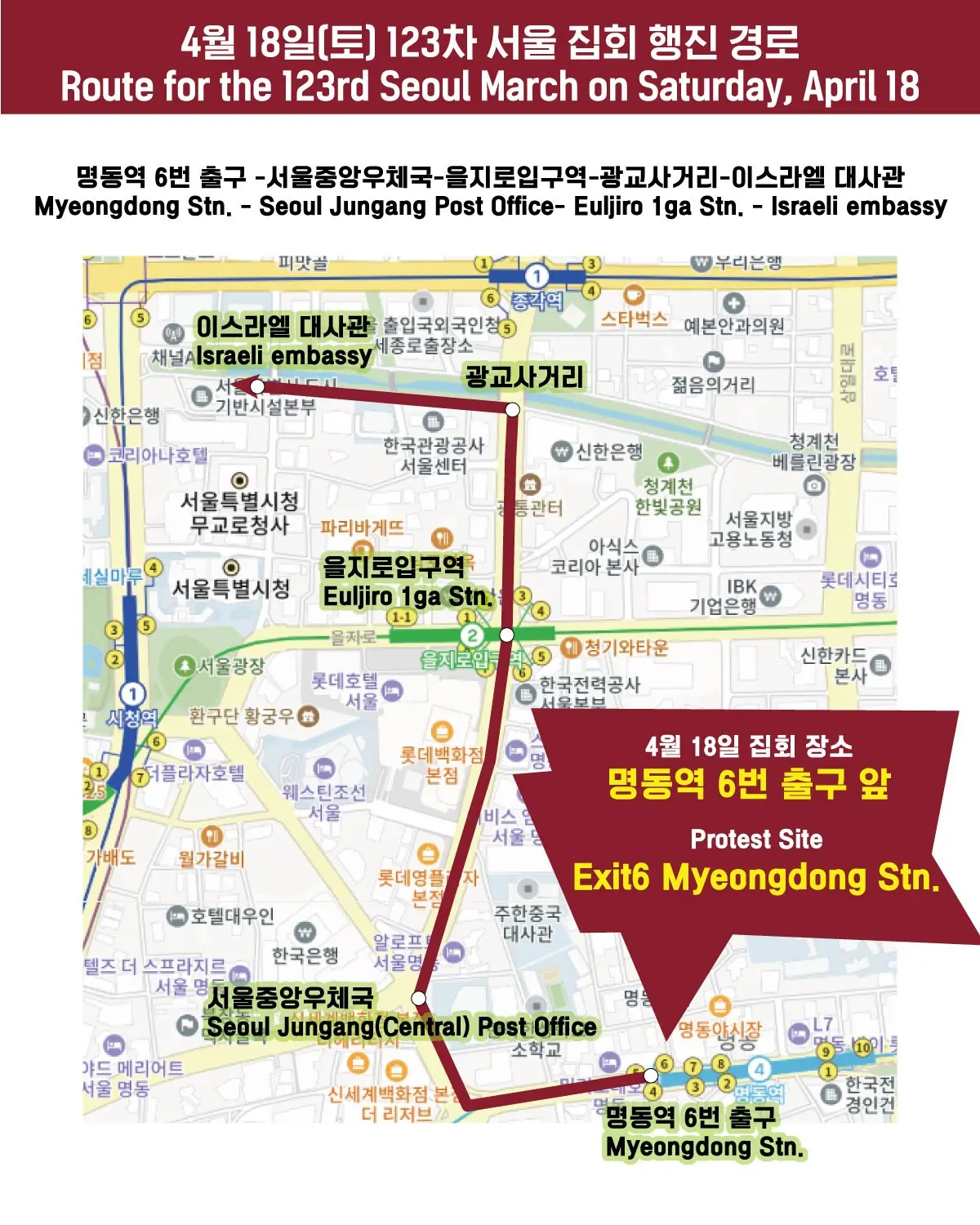 ○ 집회 후 행진 (명동역 6번 출구 – 서울중앙우체국 – 을지로입구역 – 광교사거리 – 이스라엘 대사관 맞은편)