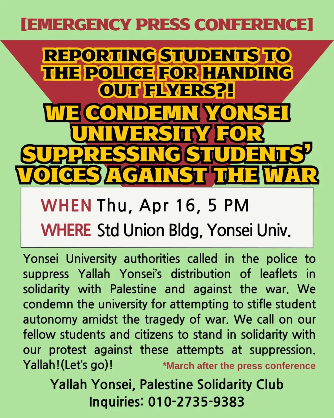 [‘Yallah Yonsei’ Emergency Press Conference] Reporting students to the police for handing out flyers?! We condemn Yonsei University for suppressing students’ voices against the war