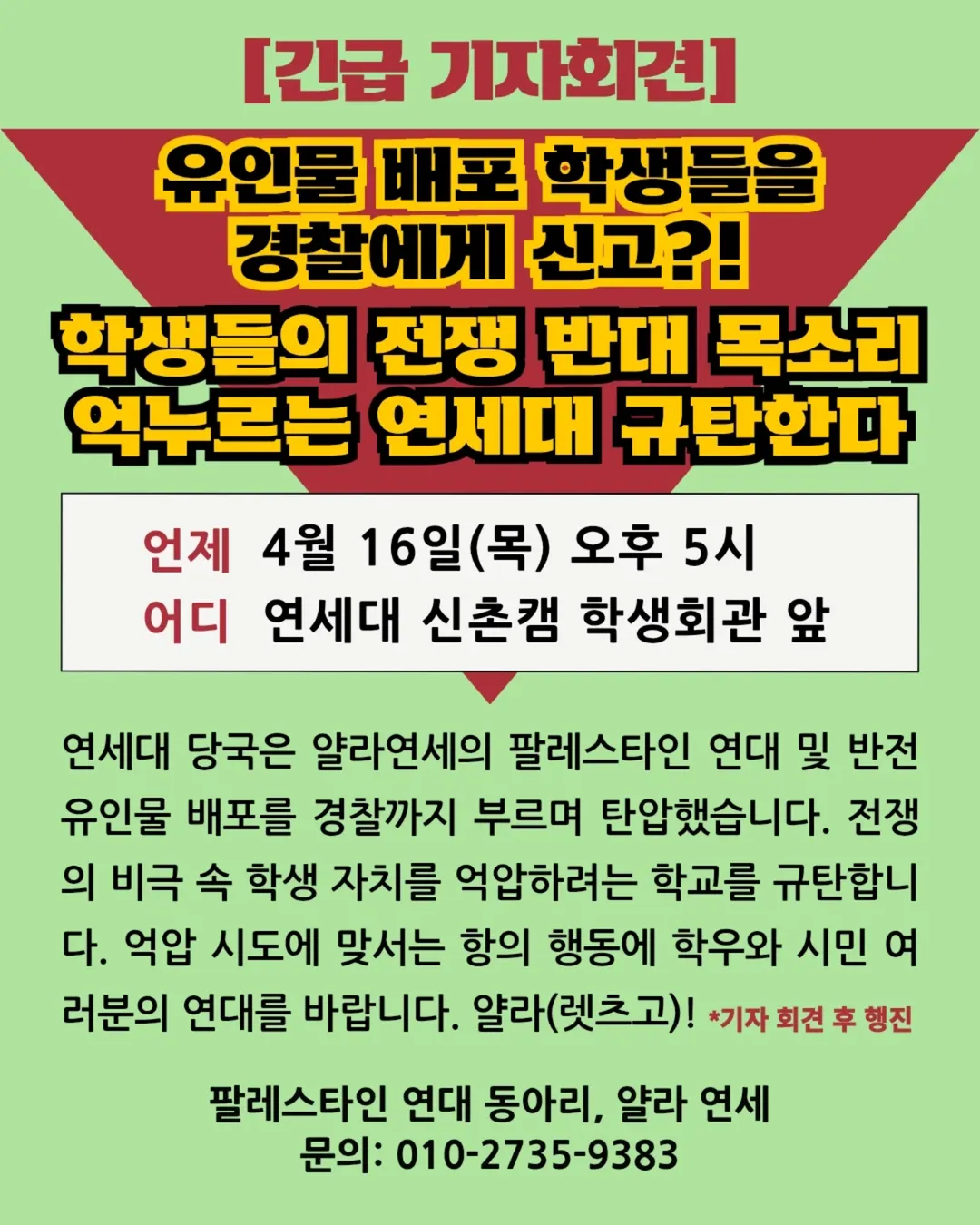 [‘얄라 연세’ 긴급 기자회견] 유인물 배포 학생들을 경찰에게 신고?! 학생들의 전쟁 반대 목소리 억누르는 연세대 규탄한다