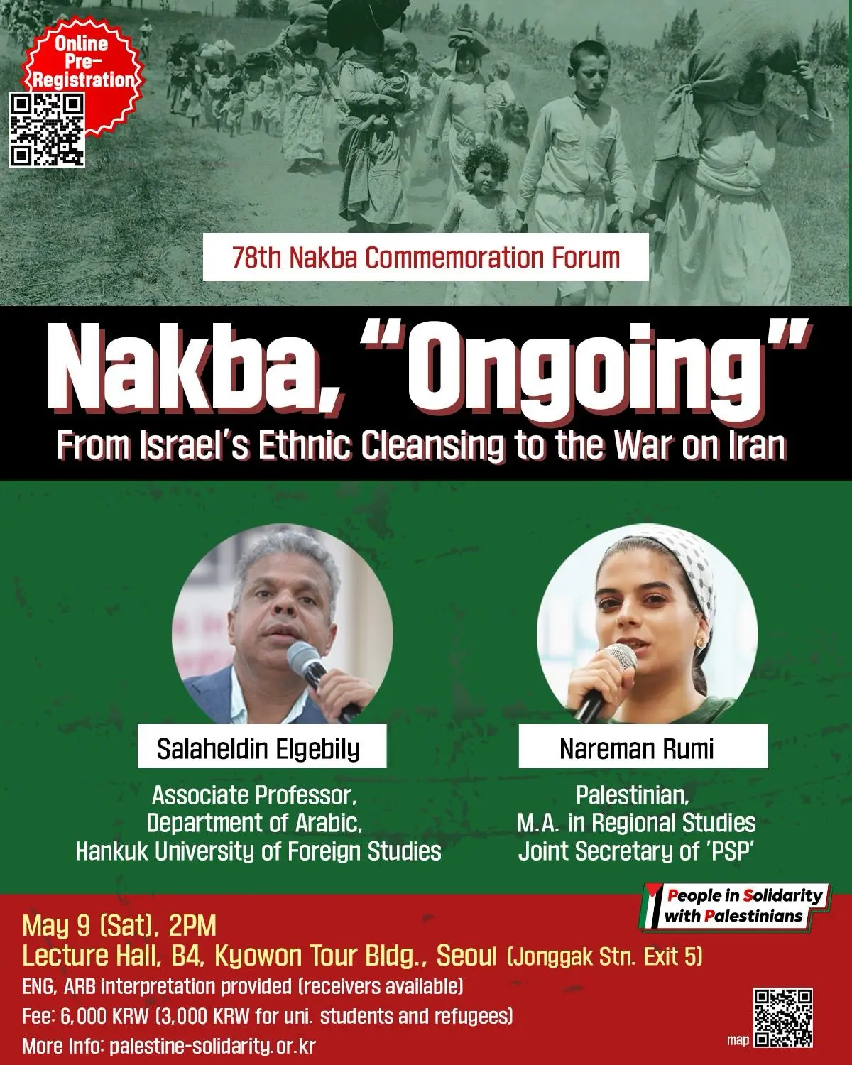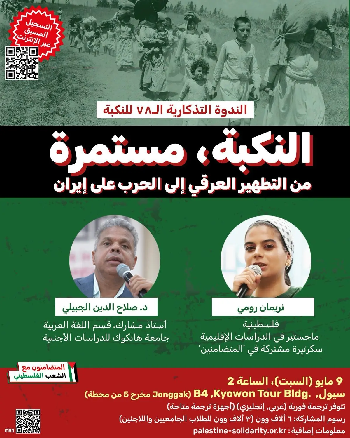 - 사전 온라인 신청: https://bit.ly/nakba78 (5월 8일 오후 6시 마감)