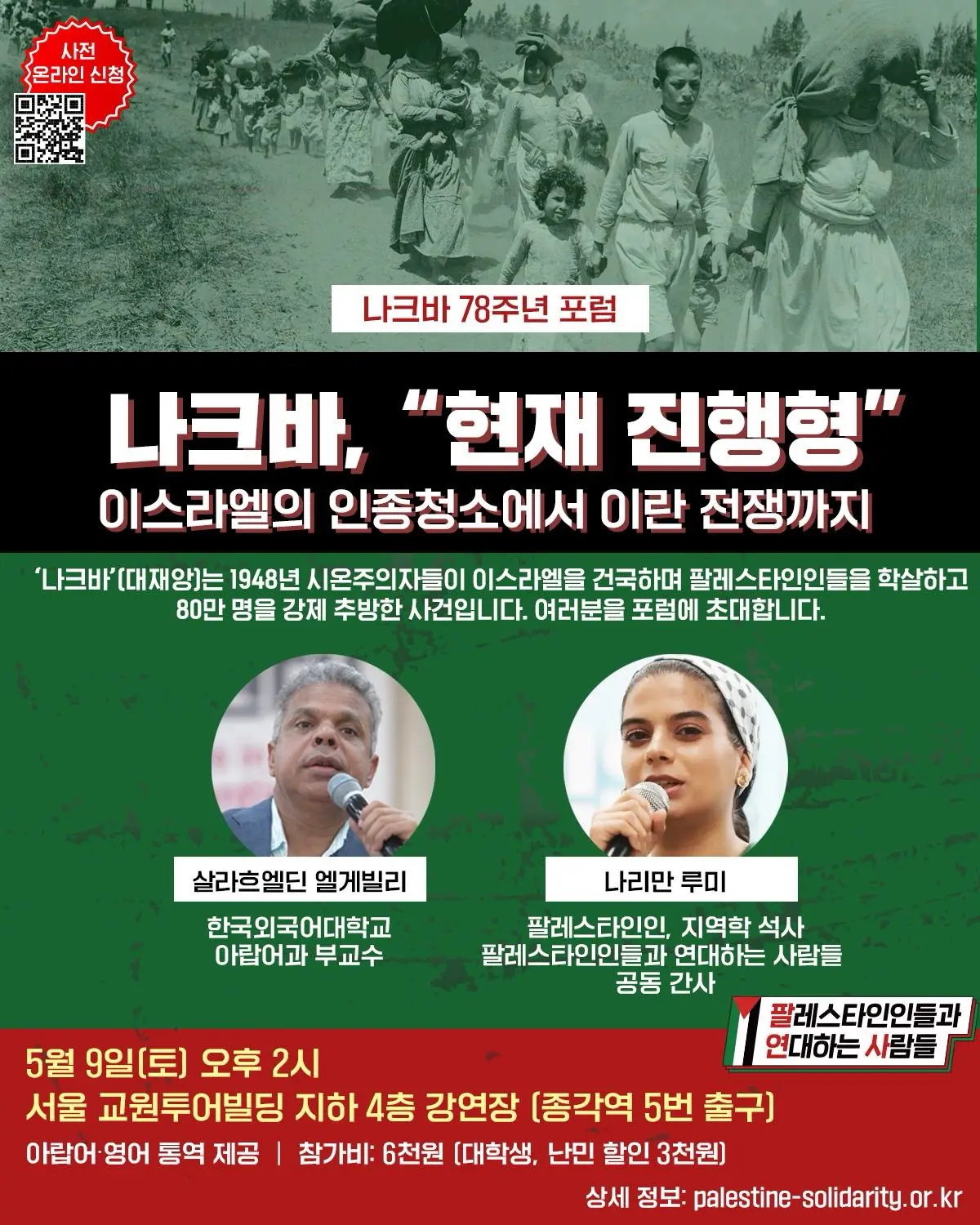 ‘나크바’(대재앙)는 1948년 시온주의자들이 이스라엘을 건국하며 팔레스타인인들을 학살하고 80만 명을 강제 추방한 사건입니다. 여러분을 포럼에 초대합니다.