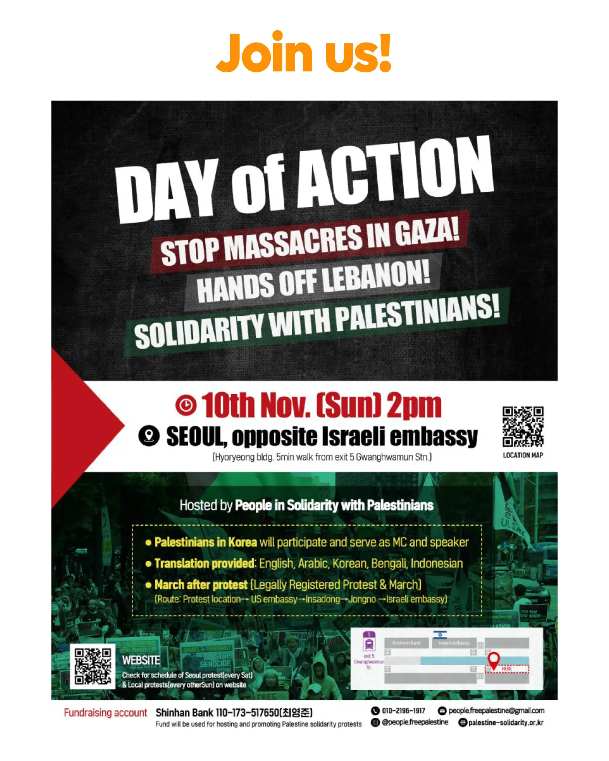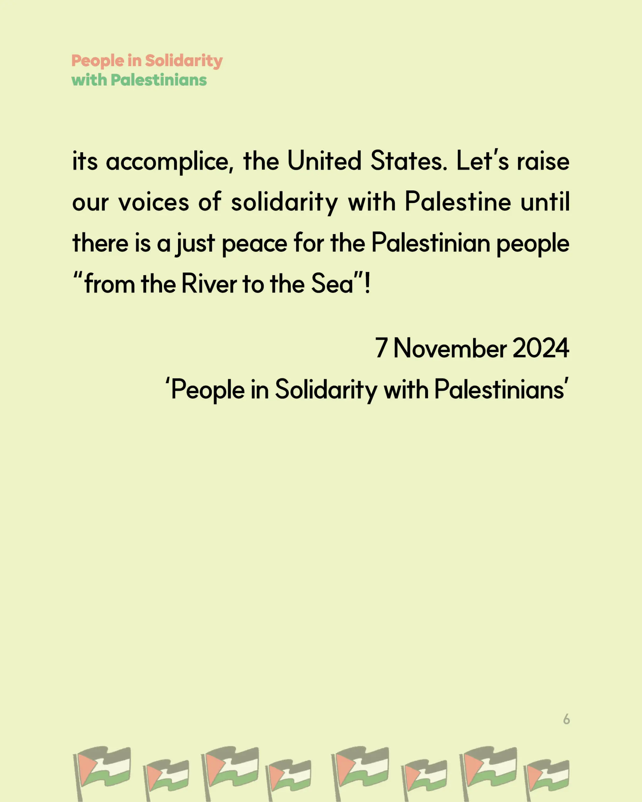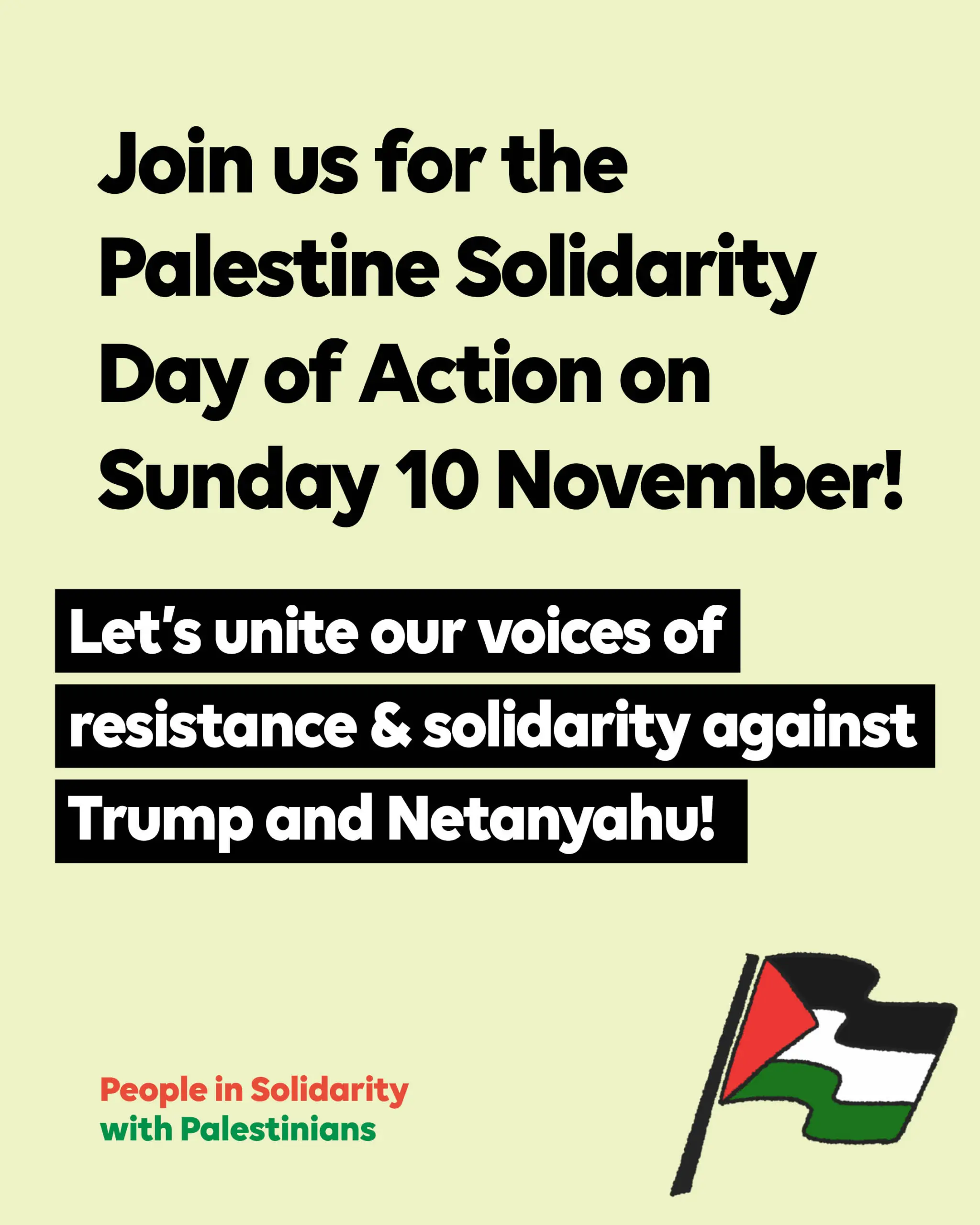 On Sunday 10 November, the Palestine Solidarity Day of Action, let’s raise our voices of resistance and solidarity against Israel and its accomplice, the United States. Let’s raise our voices of solidarity with Palestine until there is a just peace for the Palestinian people “from the River to the Sea”!
