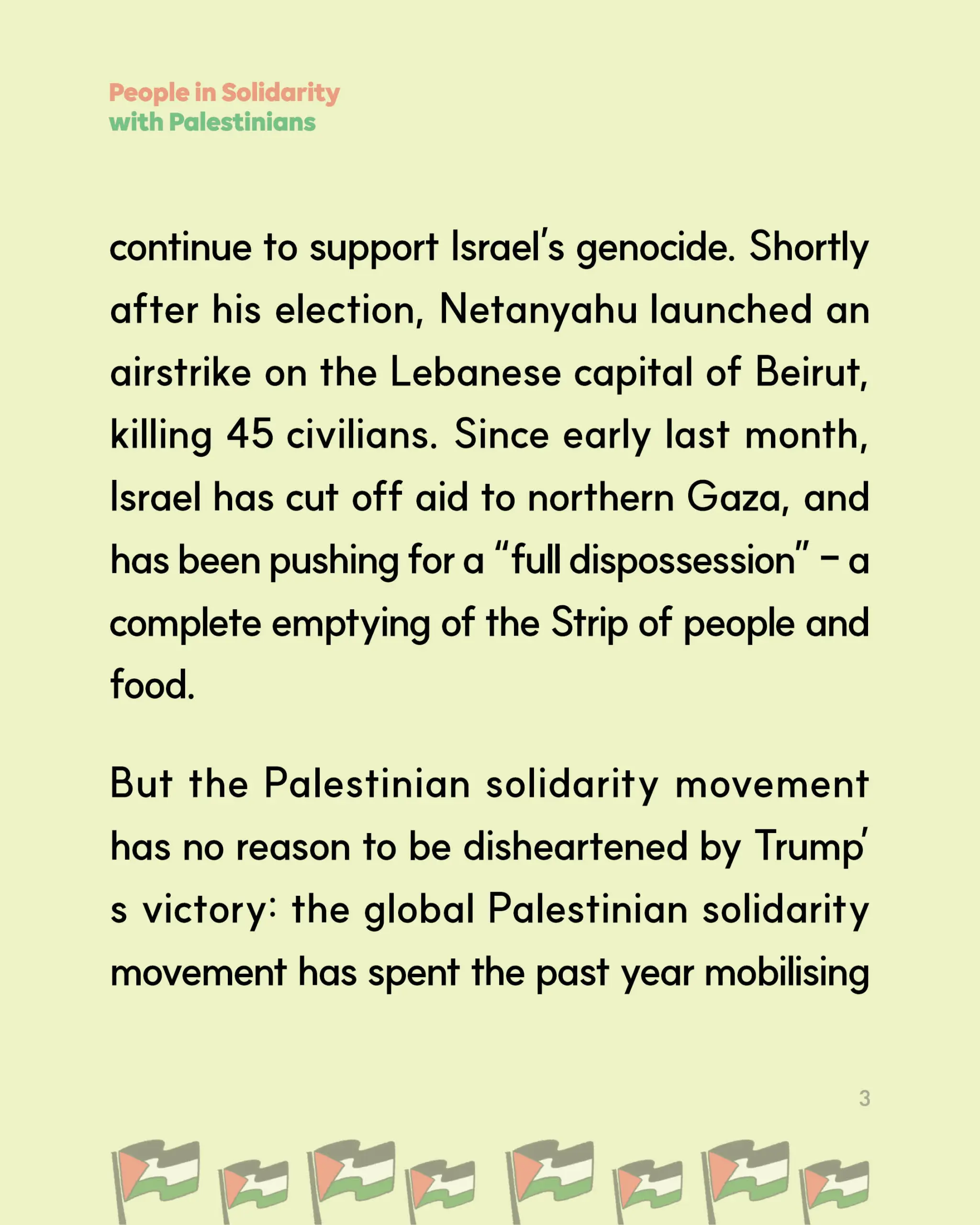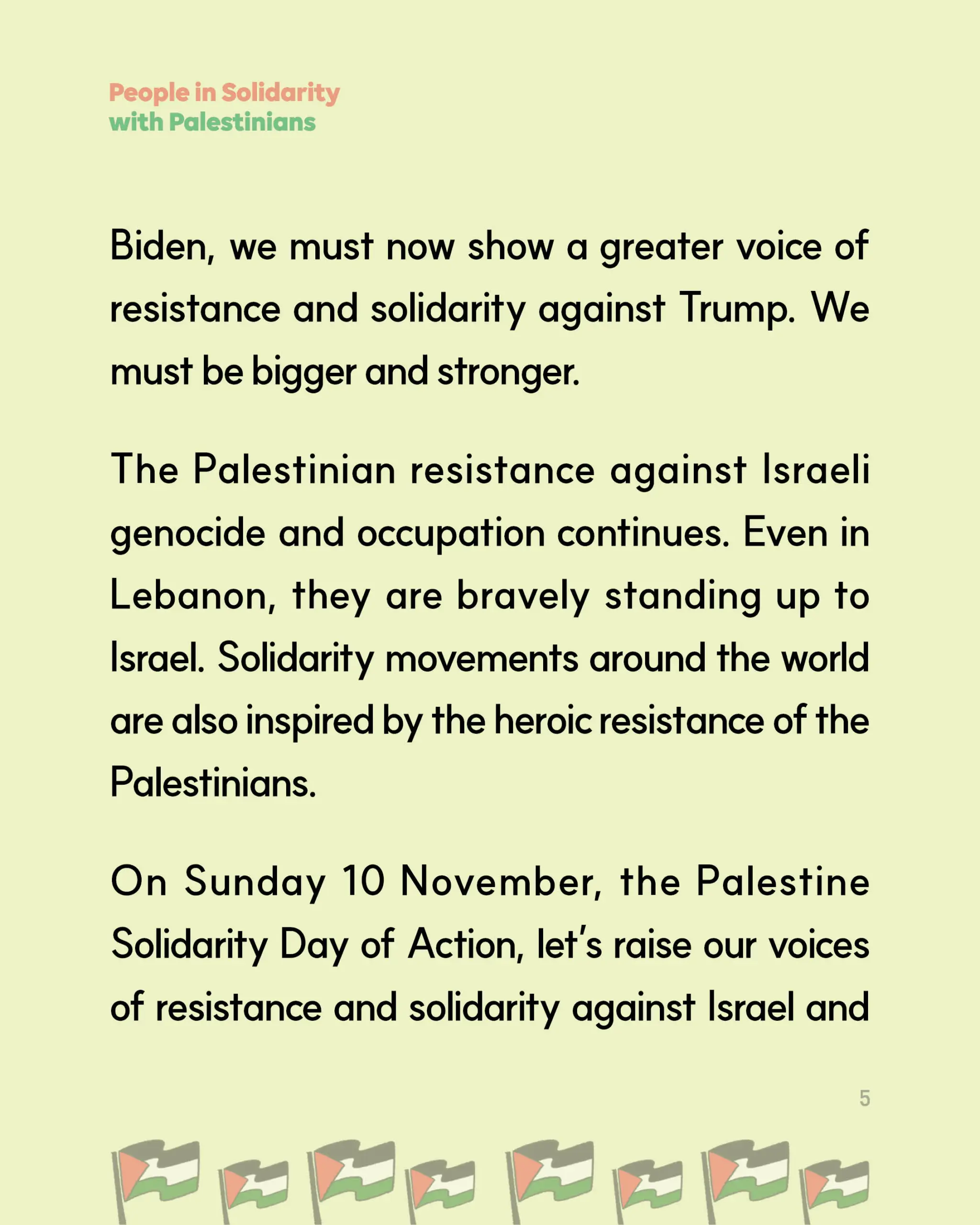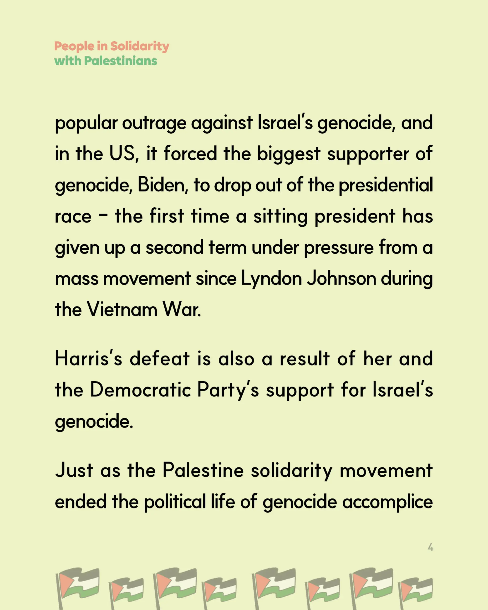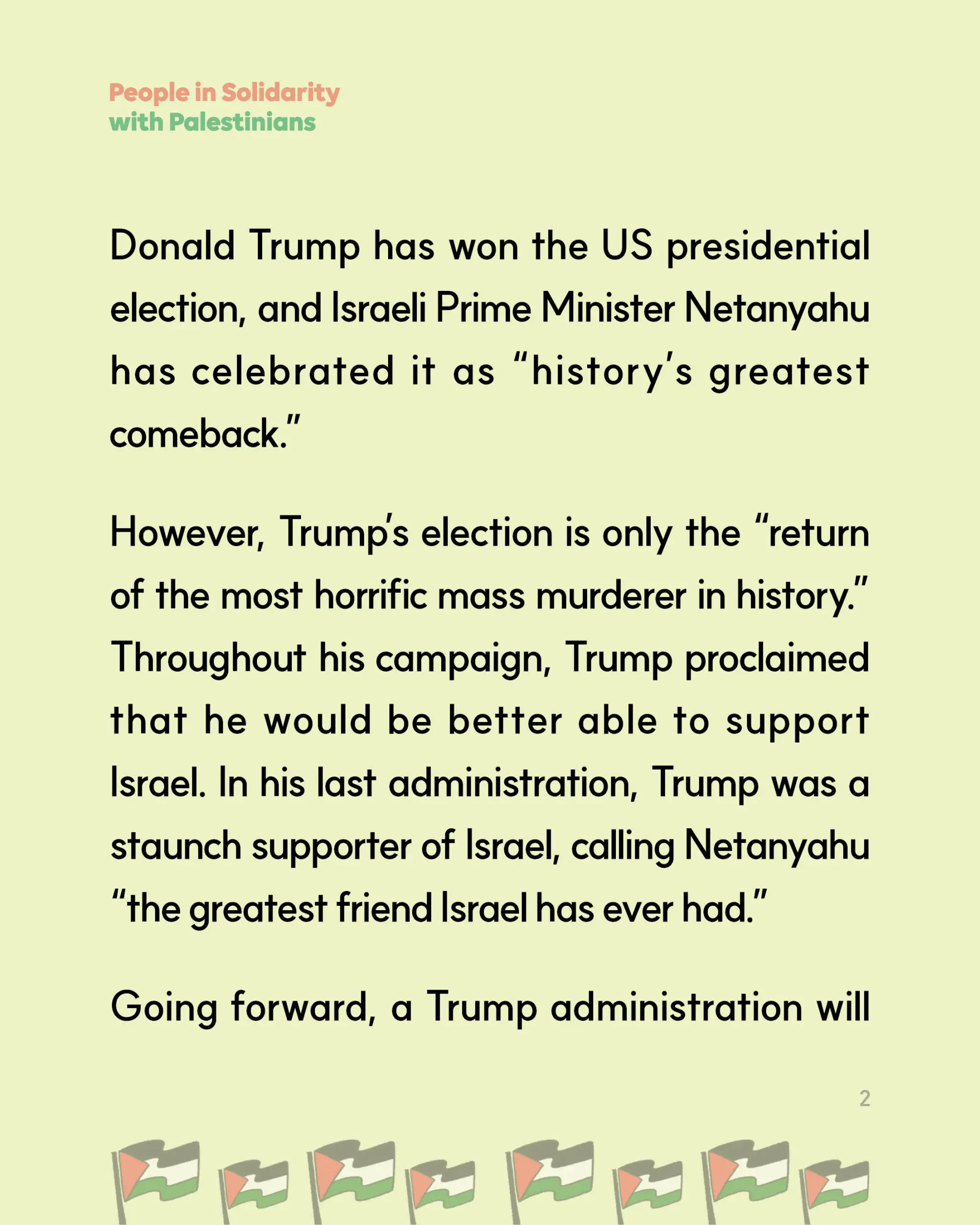 Just as the Palestine solidarity movement ended the political life of genocide accomplice Biden, we must now show a greater voice of resistance and solidarity against Trump. We must be bigger and stronger.
